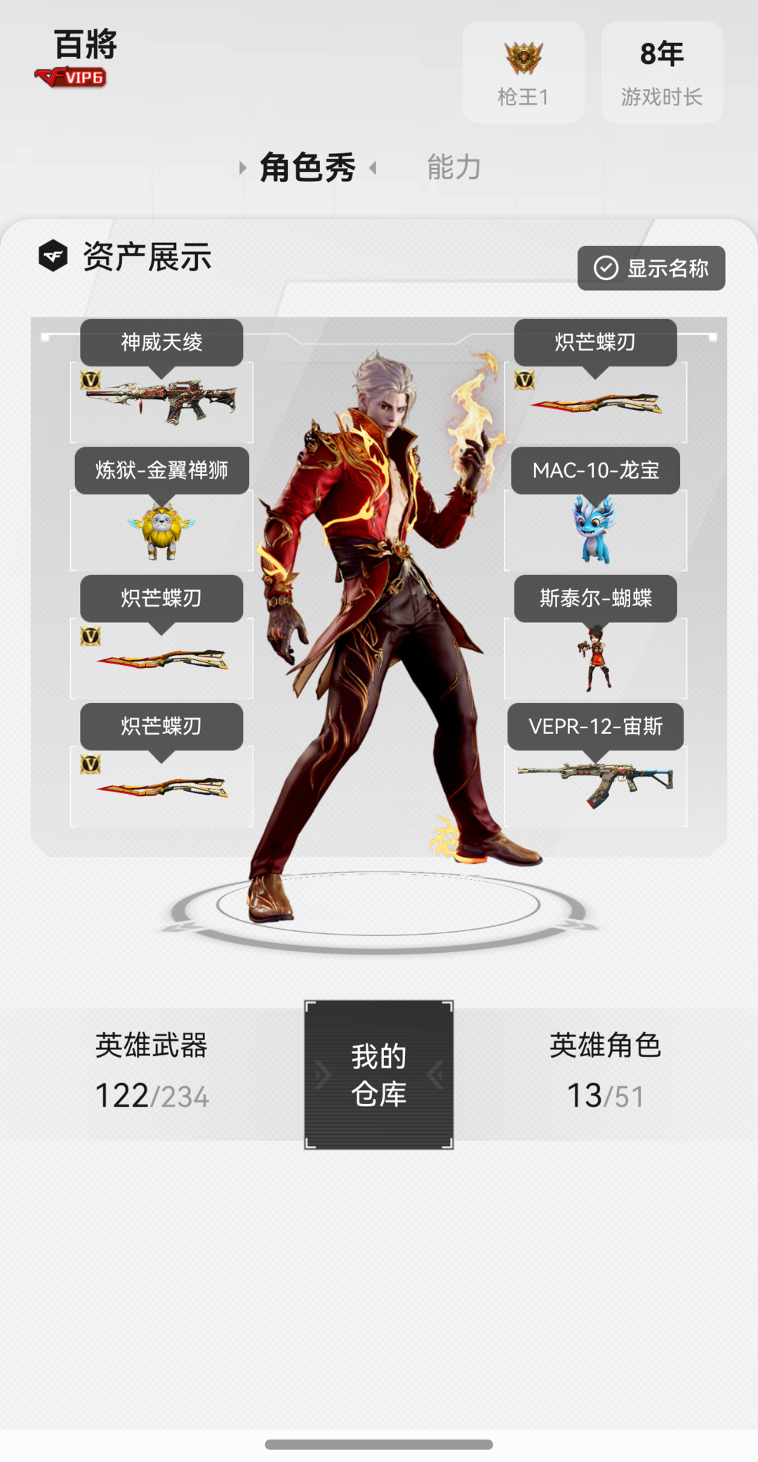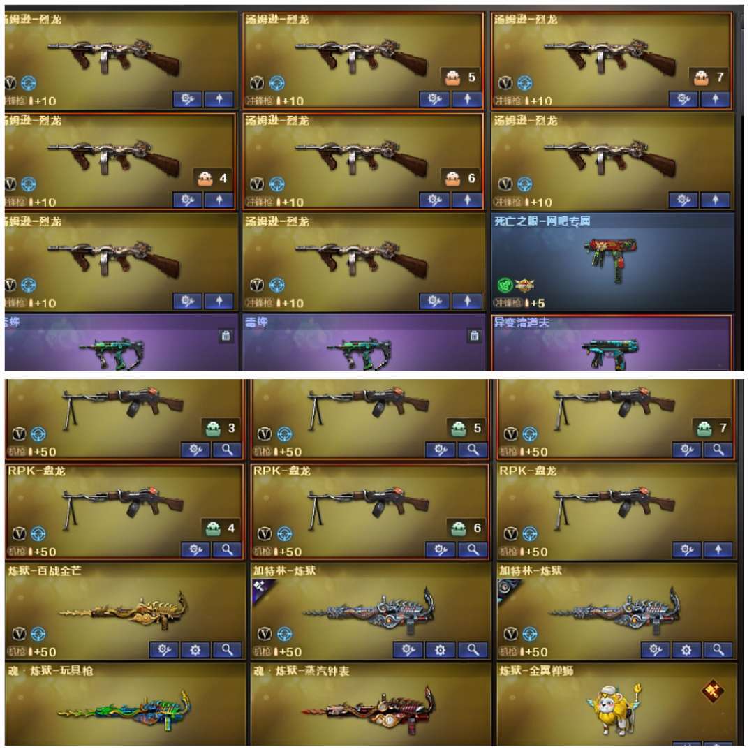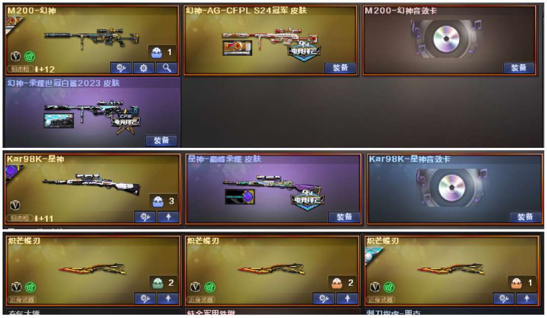 传说神威莲华,虹儿,炼狱金翼禅狮龙宝3把蝴蝶刀压力镇魔宙斯不退包。排位主流武器都是皮肤+音效卡