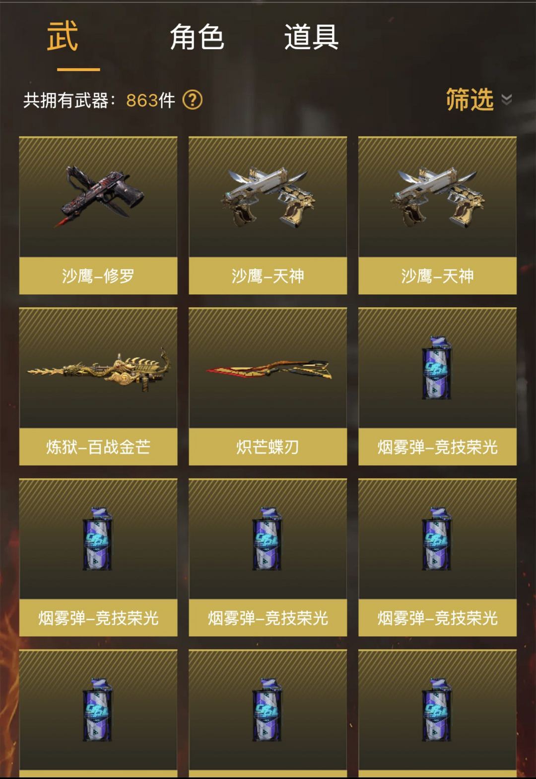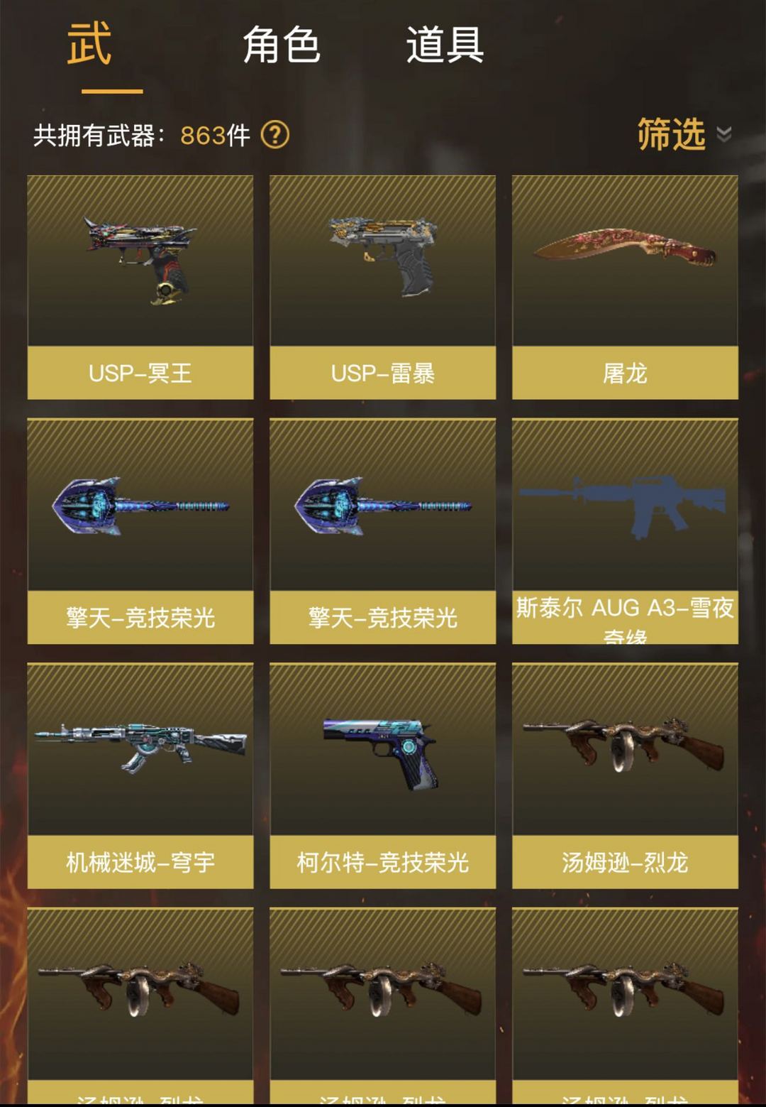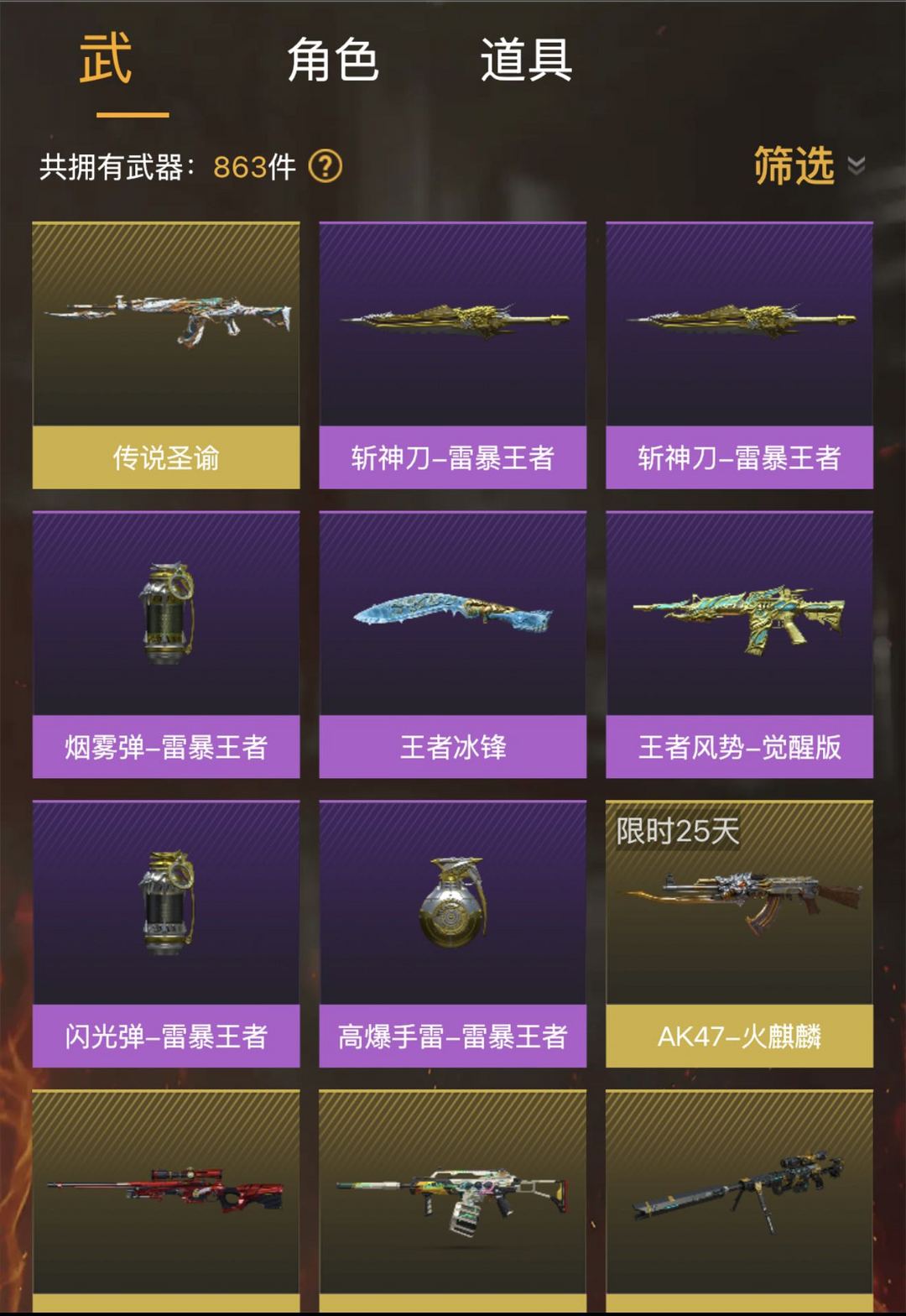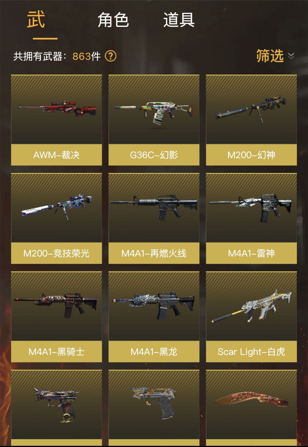 传说圣谕、G36C-幻影、幻神、usp冥王/雷暴、裁决+音效卡、白虎、蝴蝶刀、四烈等