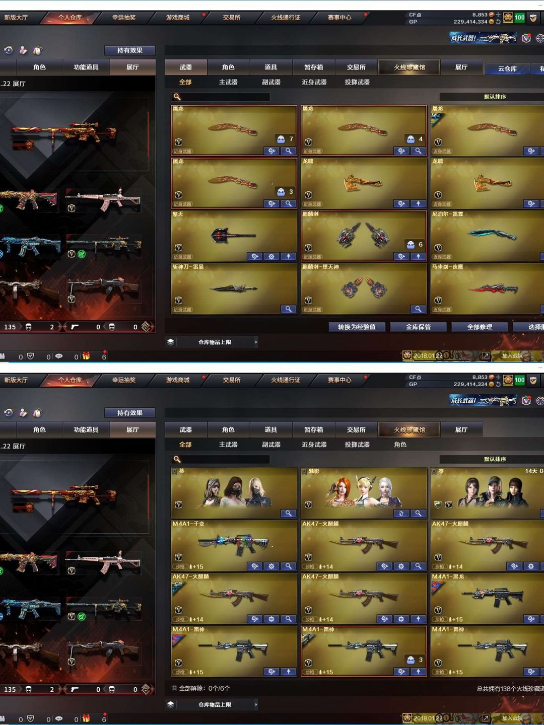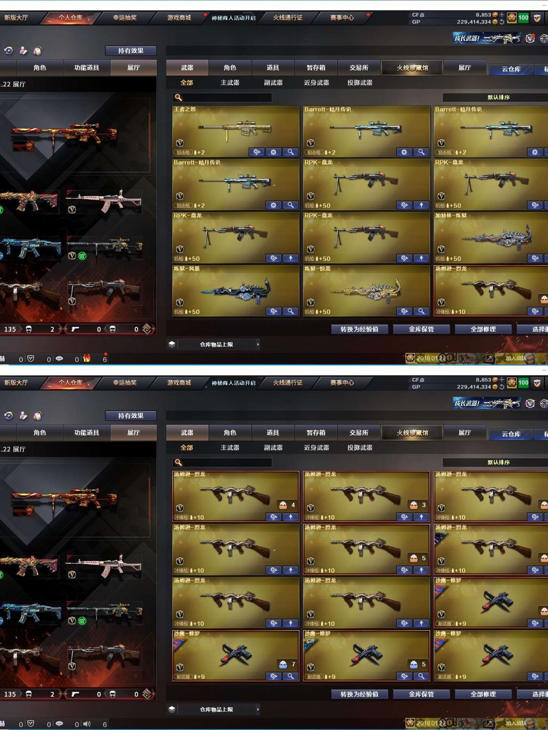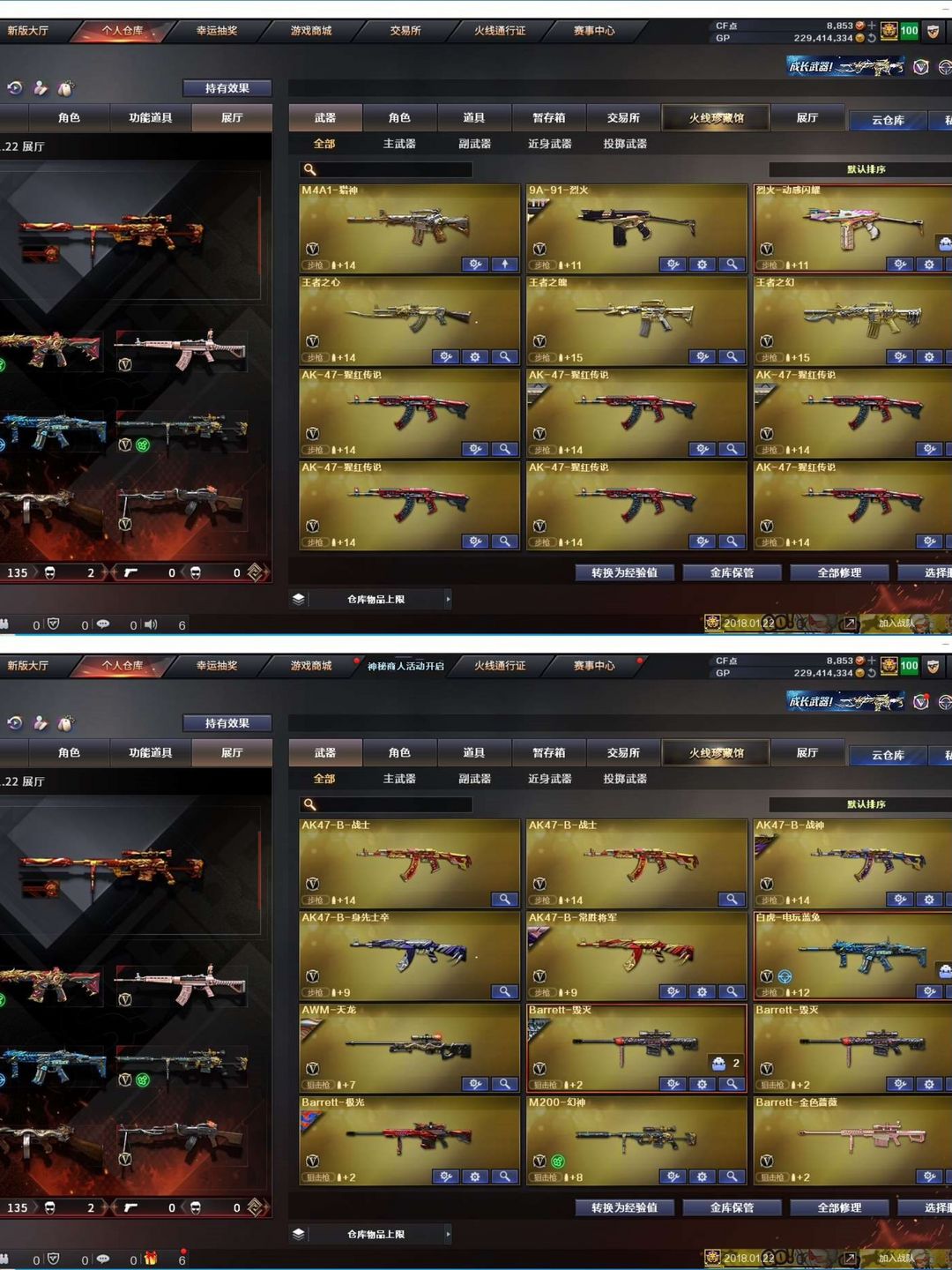 装备描述:【陕西一区/127vvip1】【6烈龙/6修罗】【m200-幻神/m200-幻神音效卡/幻神-丹凤】【柯尔特-竞技荣光/usp-神工天巧】【qbz03-金色蔷薇】【m4a1-雷神3/m4a1-雷神音效卡/雷神-宇航兔皮肤/雷神-烈虎皮肤/雷神-维纳斯皮肤/雷神-暗月/雷神-能量核心/雷神-虎将】【柯尔特-电竞装甲/沙鹰-幻兽】【barrett-毁灭2/barrett-毁灭音效卡/毁灭-星空/毁灭-风暴2/毁灭-暗月4】【ak47-火麒麟4/火麒麟-百城/火麒麟-cfstar2/火麒麟-心动糖果/火麒麟-平天大圣】【m4a1-黑骑士/m4a1-黑骑士音效卡/黑骑士耀金皮肤】【m4a1-黑龙/黑龙-能量核心】【hk417-朱雀】【烈火-动感闪耀 皮肤】【ak47-无影/无影-神兵利器】【ak47-黑武士/黑武士-锦绣游龙】【awm-天龙/天龙-秘银/天龙-能量核心】【barrett-极光/极光-能量核心】【m4a1-死神/死神-秘银2/m4a1-千变】【汤姆逊-烈龙9】【rpk-盘龙4】【加特林-炼狱/炼狱-风暴/炼狱-悦蓝】【死亡之眼】【沙鹰-修罗6/修罗-cfstar/修罗-能量核心4