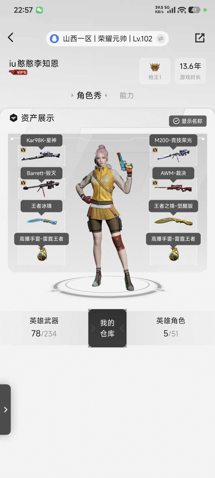 装备描述:排位精品号,裁决-叶芒苍灵,QBZ03金色蔷薇-破浪逐光,M200竞技荣光,毁灭三件套,星神,六盘六烈,白虎-电玩蓝兔,HK-417-朱雀⚡王者冰锋,爆破四防加子弹角色“鹰”,AA-12-雷霆