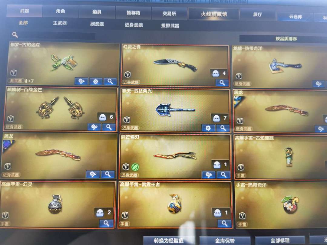 装备描述:幻神三件套,裁决三件套。蝴蝶刀,雷暴王者usp.荣耀世冠柯尔特。