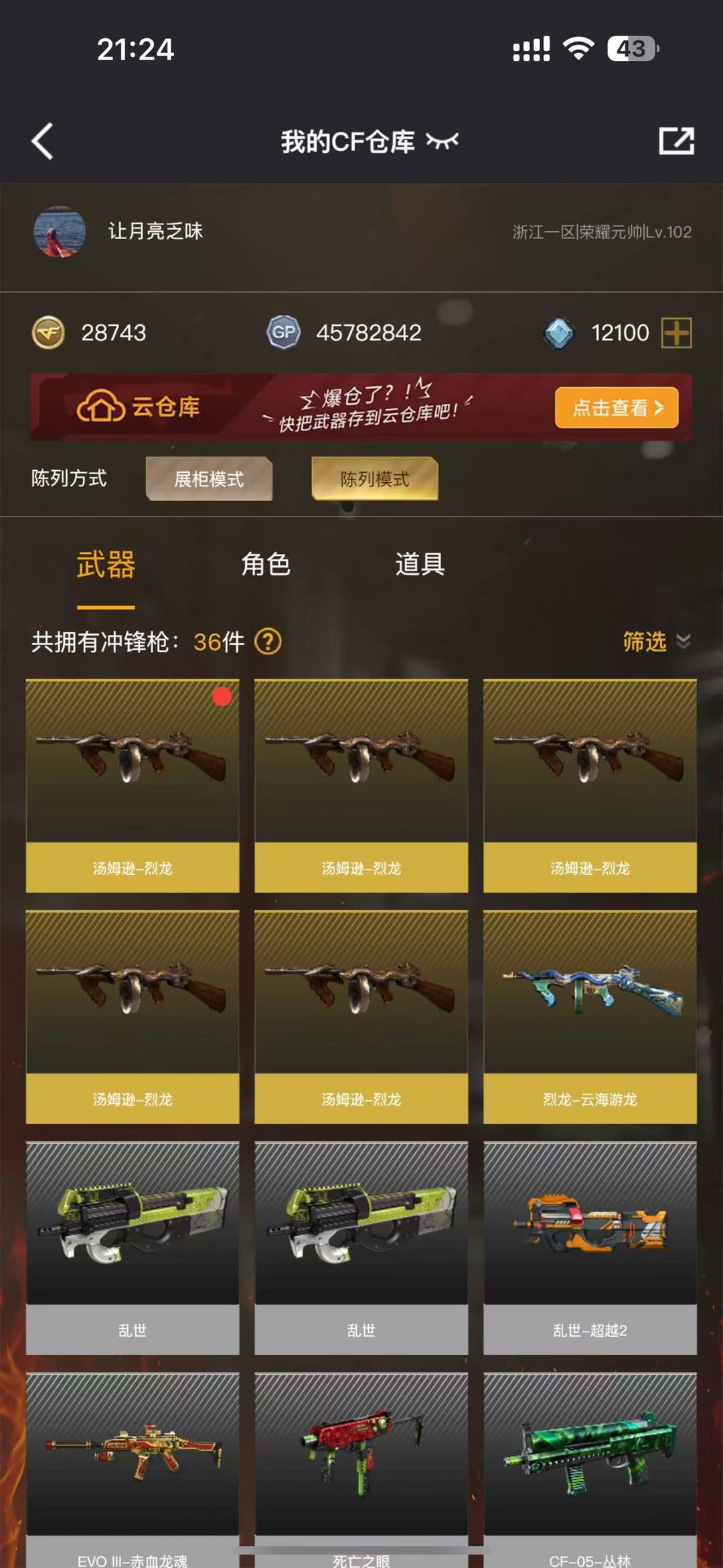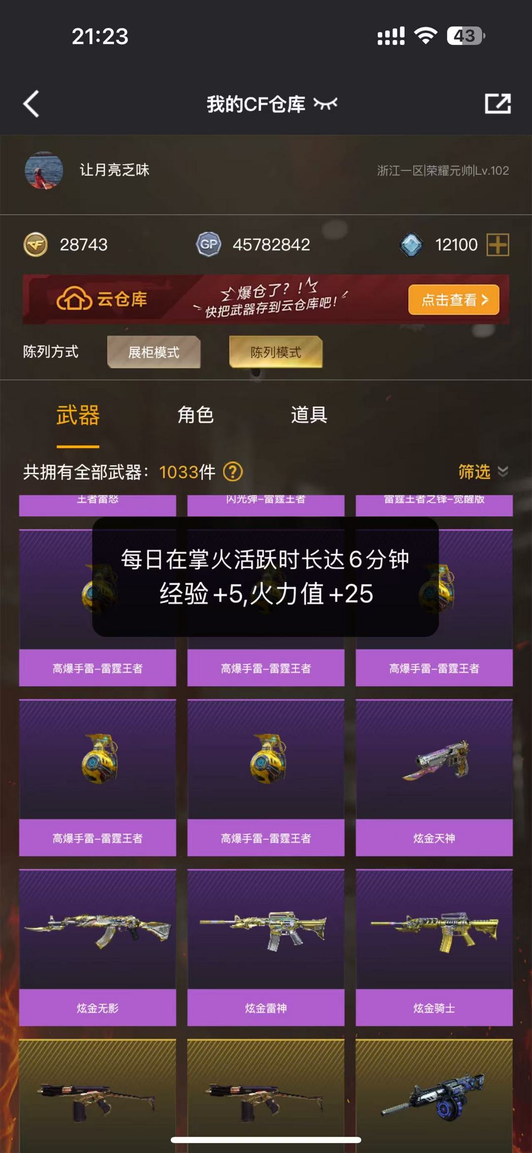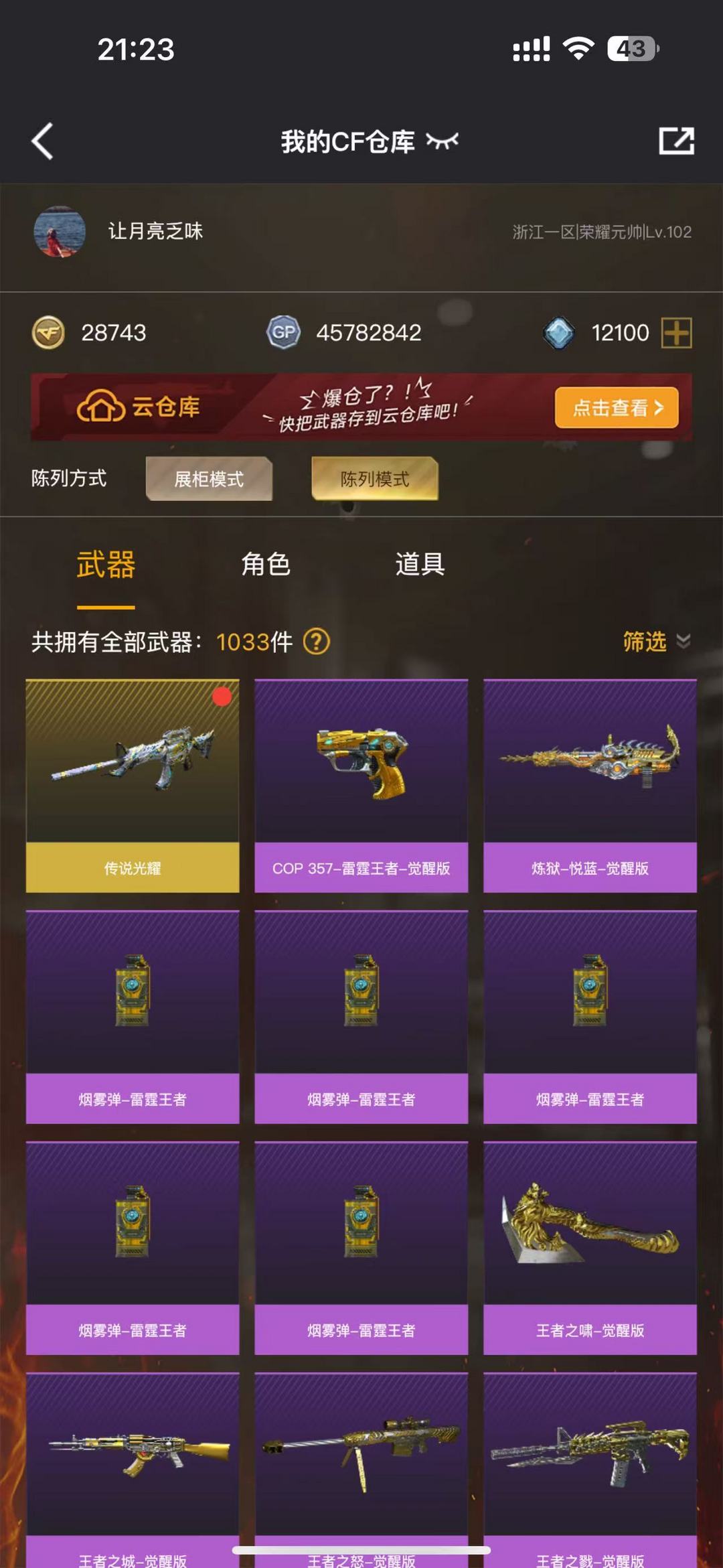 装备描述:王者武器:炫金天神;雷霆王者之锋-觉醒版;王者之城-觉醒版;炼狱-悦蓝-觉醒版;王者雷怒;王者炎心-觉醒版;炫金雷神;COP 357-雷霆王者-觉醒版;高爆手雷-雷霆王者;烟雾弹-雷霆王者;闪光弹-雷霆王者;高爆手雷-雷霆王者;王者之戮-觉醒版;王者之啸-觉醒版;王者之魄-觉醒版;炫金无影;王者之武-觉醒版;炫金骑士;王者之怒-觉醒版机械迷城-穹宇;黑武士-锦绣游龙;手雷-云海游龙;烈龙-云海游龙;擎天-云海游龙;闪光弹-幻灵;烈火-动感闪耀;天神-动感闪耀;屠龙-动感闪耀;手雷-动感闪耀;高爆手雷-神工天巧;AK47-火麒麟;白虎-电玩蓝兔;Barrett-暗月传说;M4A1-武圣;Glock18-武圣;闪光弹-竞技荣光;烟雾弹-竞技荣光;高爆手雷-竞技荣光;M200-竞技荣光;擎天-竞技荣光;USP-雷暴;柯尔特-竞技荣光;荣耀世冠-柯尔特;AK47-机械迷城;荣耀世冠-火麒麟;汤姆逊-烈龙;沙鹰-修罗;麒麟刺;QBZ03-金色蔷薇;M4A1-黑骑士;传说光耀;AWM-裁决;马来剑-夜魔;烟雾弹-夜魔;高爆手雷-夜魔;闪光弹-夜魔;AA-12-雷霆;加特林-炼狱;