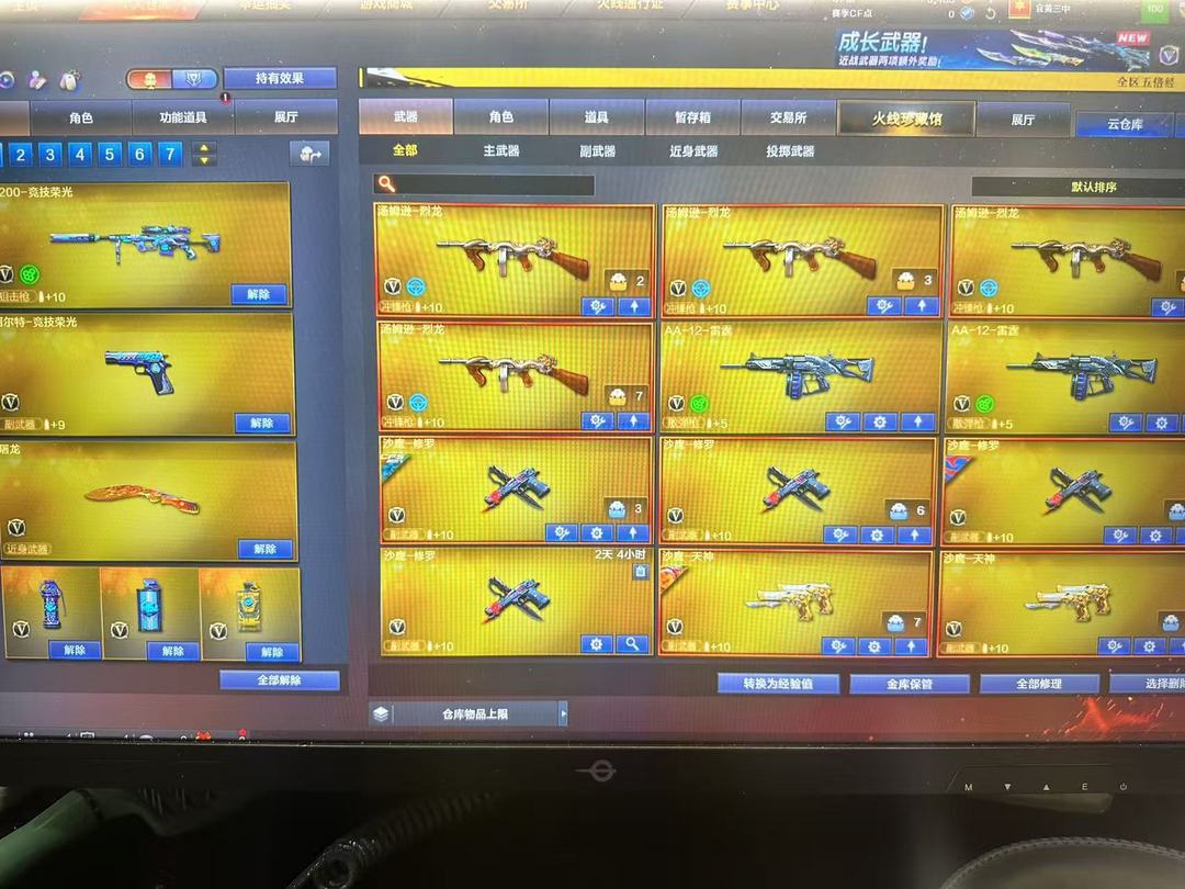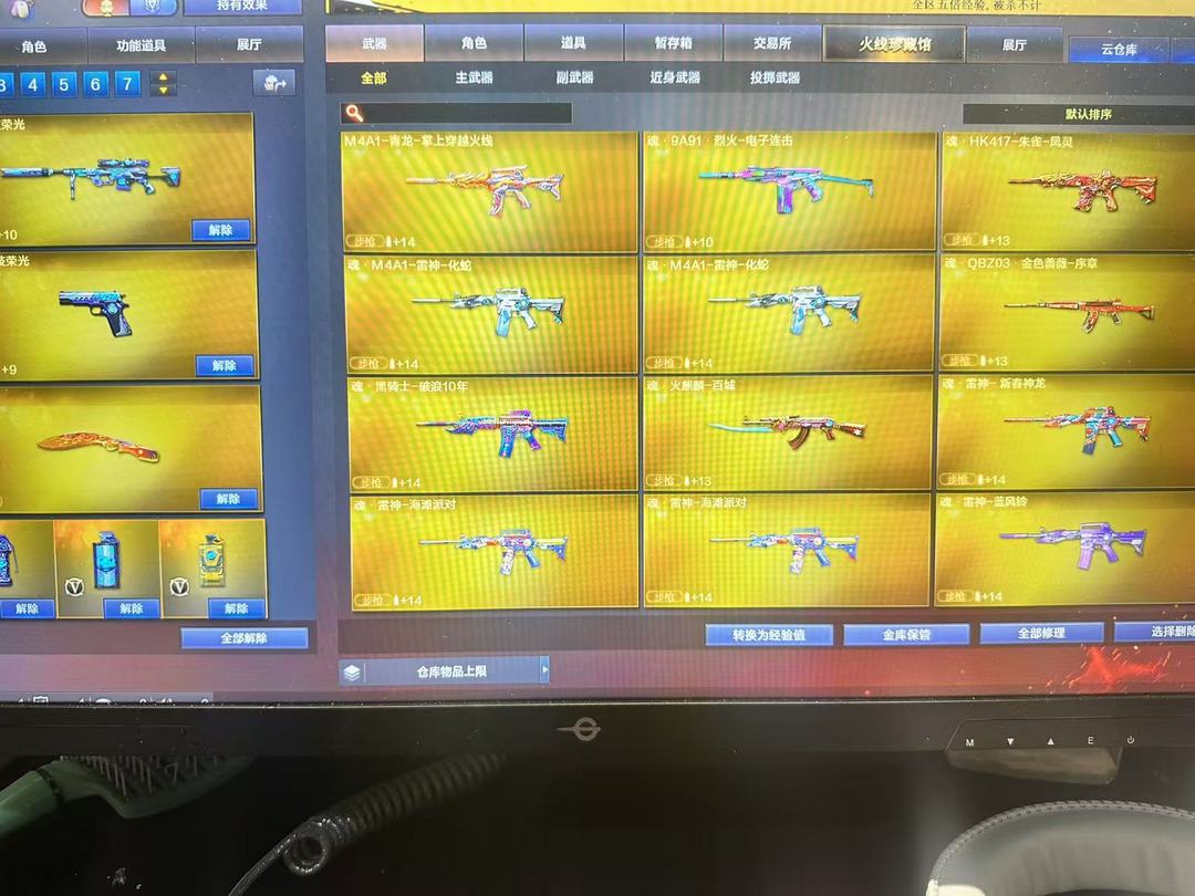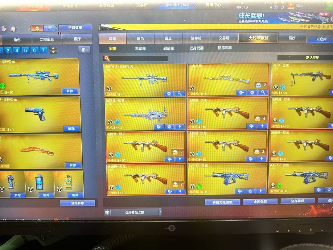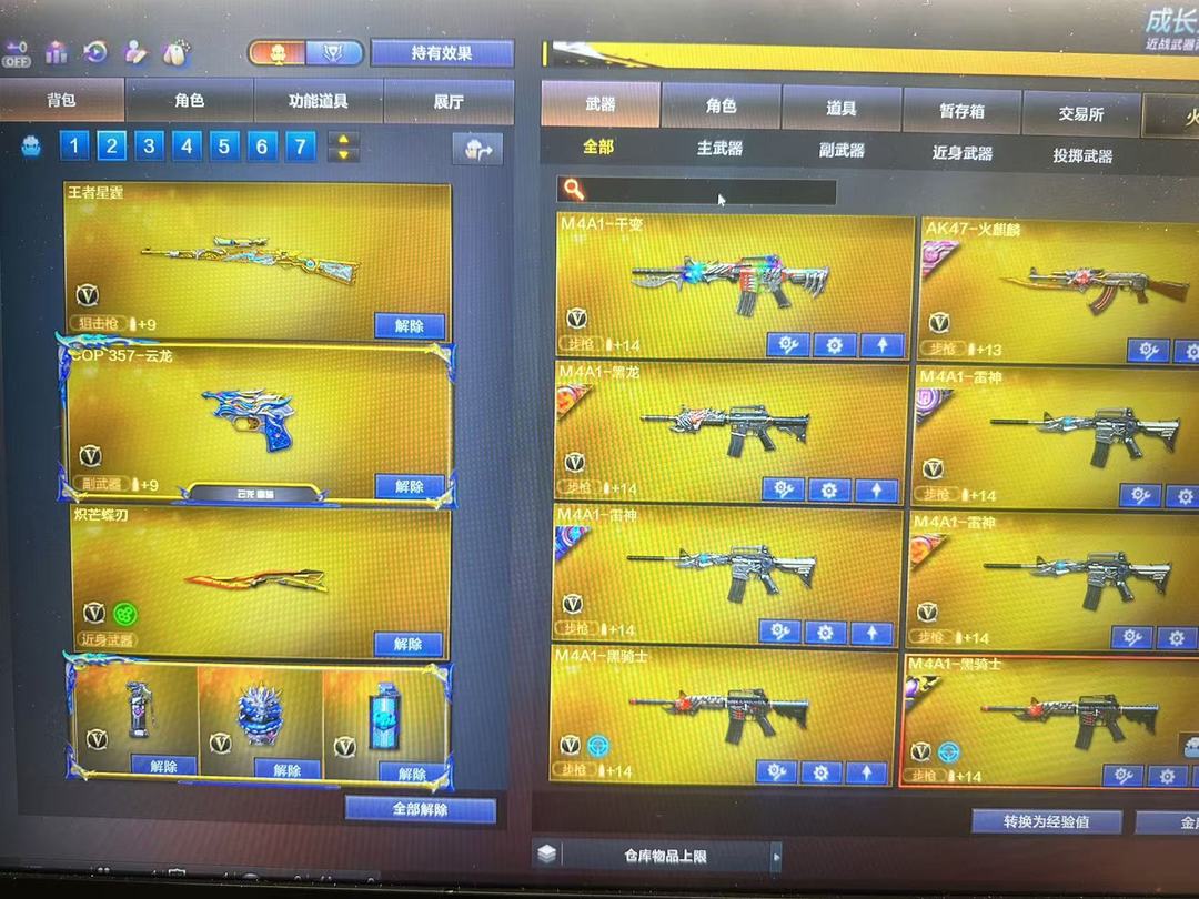 装备描述:王者武器:王者雷影;高爆手雷-雷霆王者;烟雾弹-雷霆王者-觉醒版;王者风势-觉醒版;闪光弹-雷霆王者-觉醒版;炫金黑龙;王者猎神;青龙之魄;王者之势-觉醒版;王者星霆 英雄武器:Barrett-毁灭;Barrett-毁灭;沙鹰-修罗;M4A1-雷神;闪光弹-玄豹;SCAR Light-玄豹;高爆手雷-玄豹;烟雾弹-玄豹;机械迷城-穹宇;M4A1-雷神;Barrett-暗月传说;9A91-烈火;荣耀世冠-火麒麟;AA-12-雷霆;M4A1-猎神;沙鹰-天神;AWM-裁决;M4A1-千变;QBZ03-金色蔷薇;M4A1-死神;RPK-盘龙;高爆手雷-云龙;闪光弹-云龙;烟雾弹-云龙;COP 357-云龙;QBZ03-云龙;云龙扇;AWM-天龙;汤姆逊-烈龙;黑武士-锦绣游龙;沙鹰-修罗;炽芒蝶刃;AK47-黑武士;龙啸-烈火龙威;高爆手雷-神工天巧;唐刀-神工天巧;烟雾弹-神工天巧;闪光弹-神工天巧;无影-神兵利器;AK47-火麒麟;麒麟刺;AK47-机械迷城;高爆手雷-竞技荣光;擎天-竞技荣光;柯尔特-竞技荣光;M200-竞技荣光;烟雾弹-竞技荣光;闪光弹-竞技荣光;M4A1-黑骑士;B