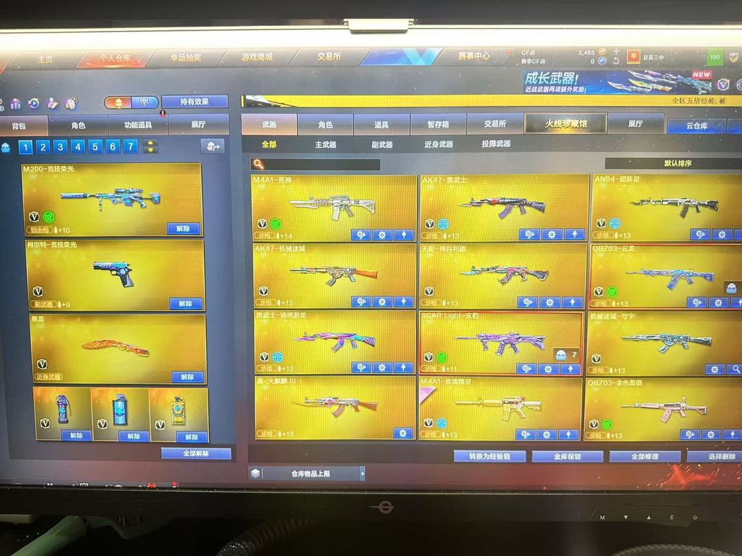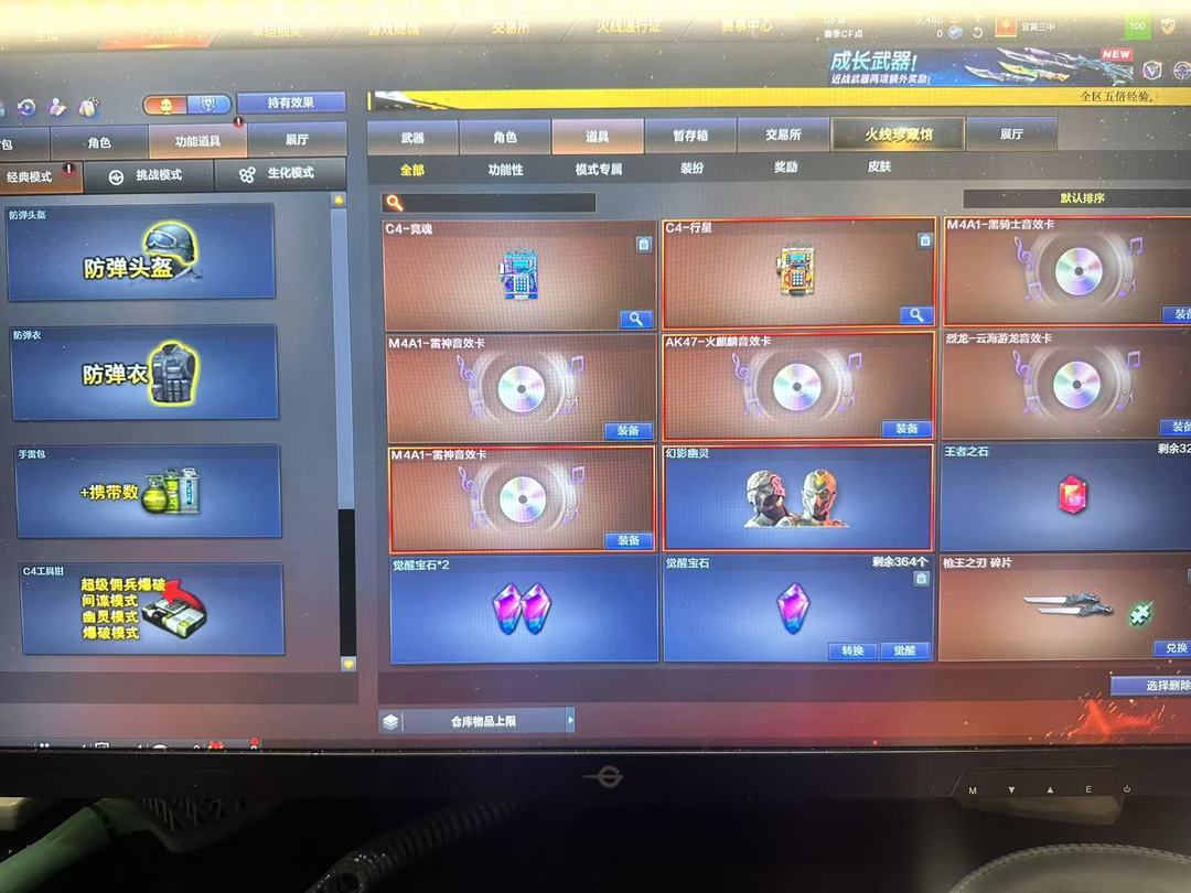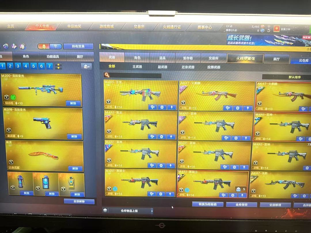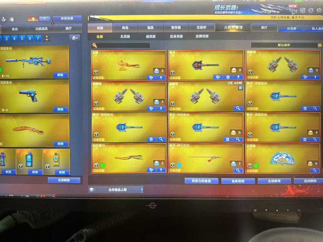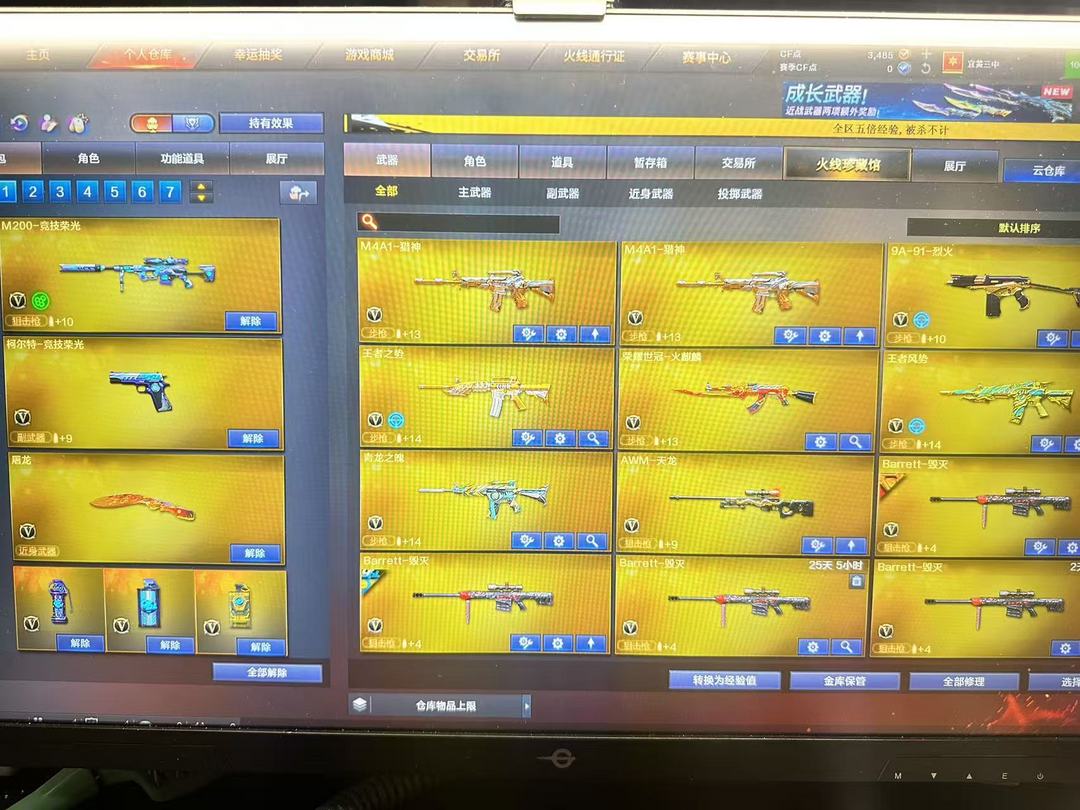 装备描述:王者武器:王者雷影;高爆手雷-雷霆王者;烟雾弹-雷霆王者-觉醒版;王者风势-觉醒版;闪光弹-雷霆王者-觉醒版;炫金黑龙;王者猎神;青龙之魄;王者之势-觉醒版;王者星霆 英雄武器:Barrett-毁灭;Barrett-毁灭;沙鹰-修罗;M4A1-雷神;闪光弹-玄豹;SCAR Light-玄豹;高爆手雷-玄豹;烟雾弹-玄豹;机械迷城-穹宇;M4A1-雷神;Barrett-暗月传说;9A91-烈火;荣耀世冠-火麒麟;AA-12-雷霆;M4A1-猎神;沙鹰-天神;AWM-裁决;M4A1-千变;QBZ03-金色蔷薇;M4A1-死神;RPK-盘龙;高爆手雷-云龙;闪光弹-云龙;烟雾弹-云龙;COP 357-云龙;QBZ03-云龙;云龙扇;AWM-天龙;汤姆逊-烈龙;黑武士-锦绣游龙;沙鹰-修罗;炽芒蝶刃;AK47-黑武士;龙啸-烈火龙威;高爆手雷-神工天巧;唐刀-神工天巧;烟雾弹-神工天巧;闪光弹-神工天巧;无影-神兵利器;AK47-火麒麟;麒麟刺;AK47-机械迷城;高爆手雷-竞技荣光;擎天-竞技荣光;柯尔特-竞技荣光;M200-竞技荣光;烟雾弹-竞技荣光;闪光弹-竞技荣光;M4A1-黑骑士;B