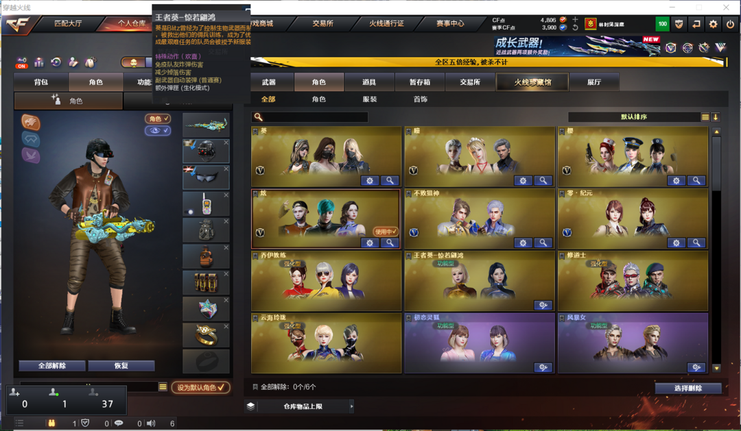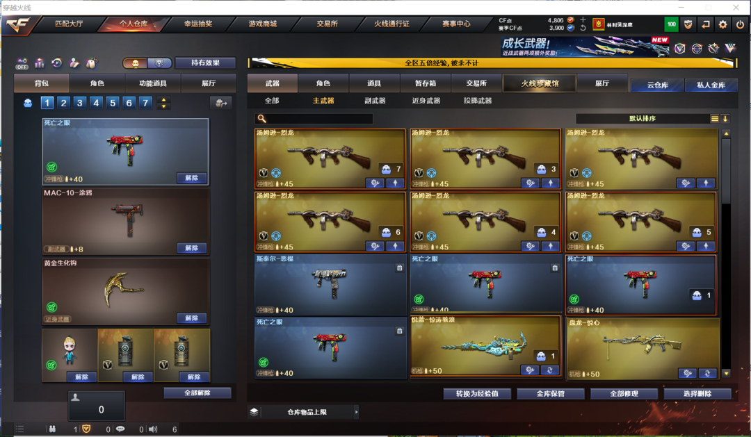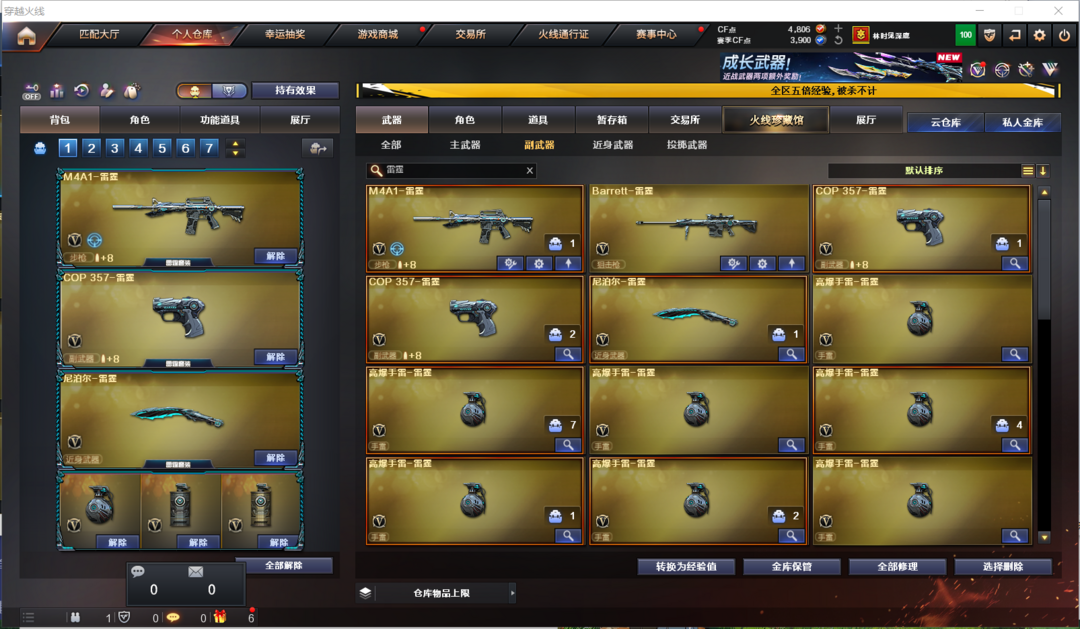 装备描述:排位:可以、、、、、、、生化全装:无需换弹、6烈、盘龙、炼狱、死亡之眼、双面神、MAC涂鸦、生化减速雷、超级对讲机、全部弹匣、、、、、、、、爆破四防:2把COP雷霆、雷霆全套、QBZ金色蔷薇、、毁灭音效、、、7套雷霆、2套雷暴、、、爆破四防(王者惊若翩鸿)