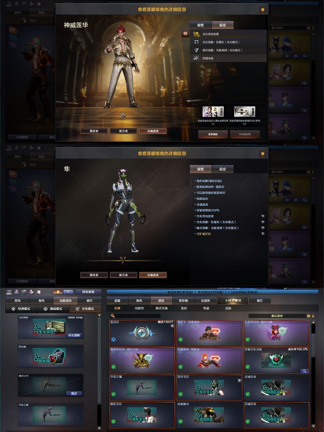 装备描述:首发神威莲华天凌☢️生化号|2炽芒蝶刃|2国王鬃狮+迎春狮炼狱音6盘|蝴蝶毒刺蛇影6烈|幻影天戎双面神 喜欢本账号请点 ☆收藏☆ 方便下次租用,谢谢光临惠顾!