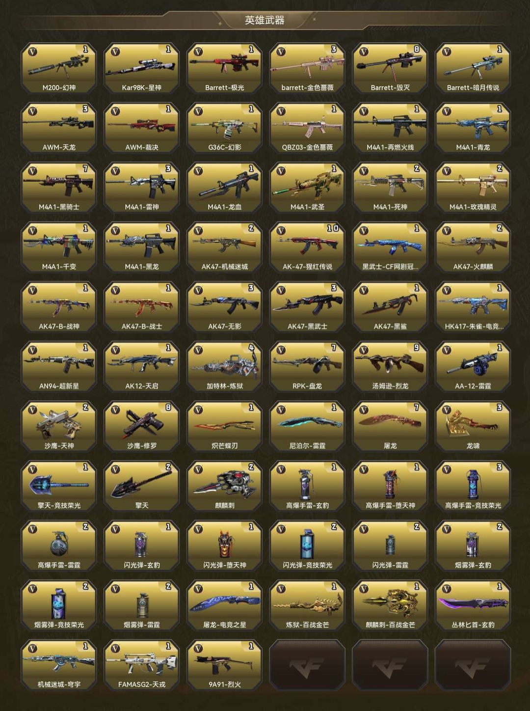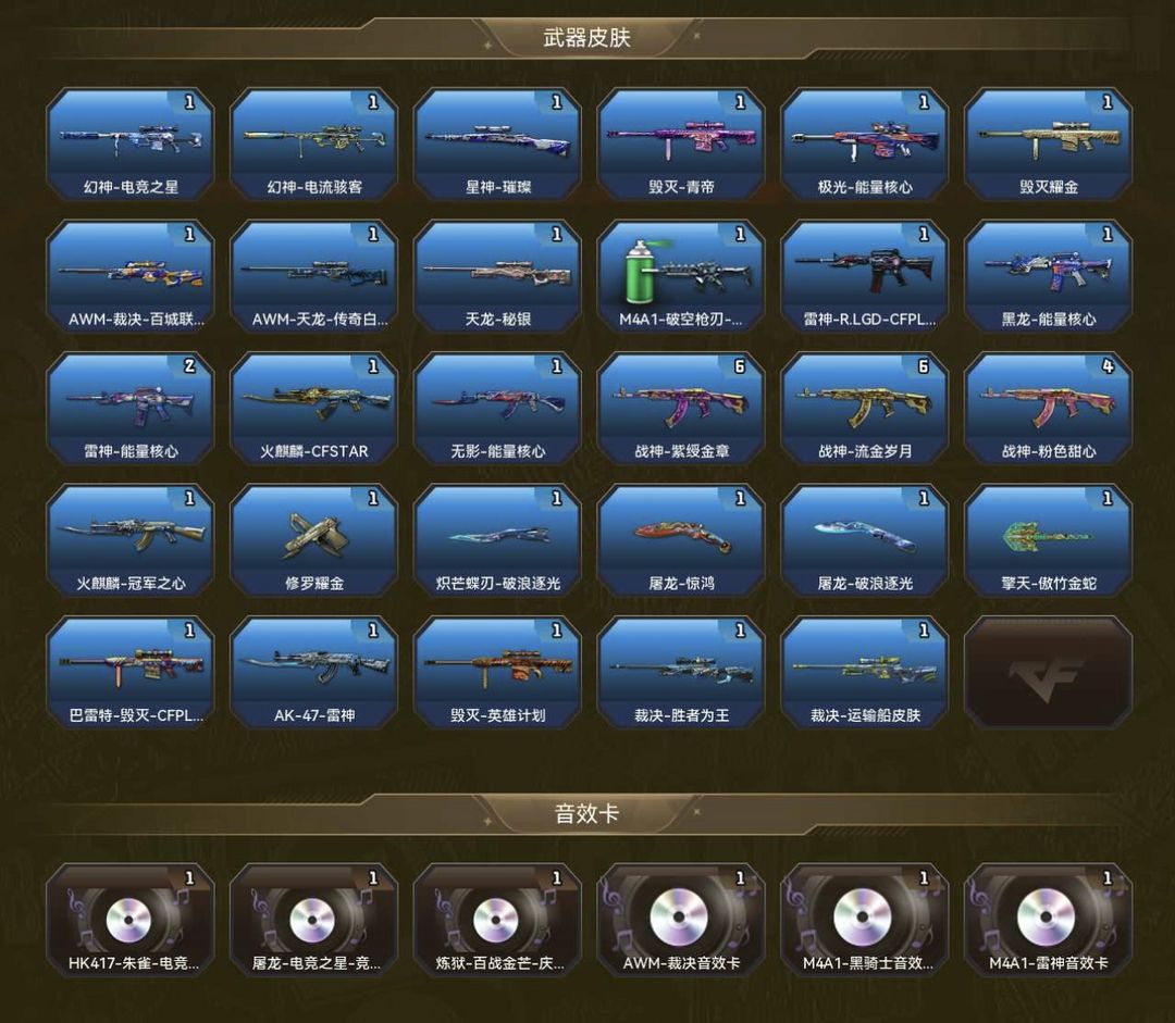装备描述:幻影|天戎|炽芒蝶刃|璀璨星神|电流骇客幻神|裁决2皮+卡|7盘10烈|炼狱|蝴蝶|毒蜂|清道夫(双全装)