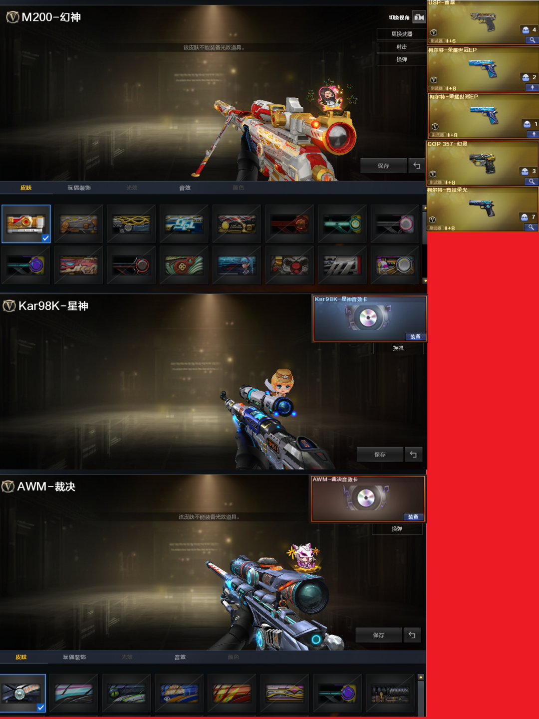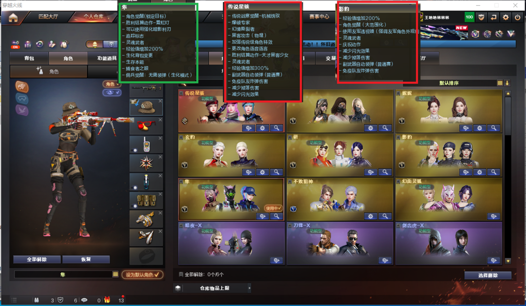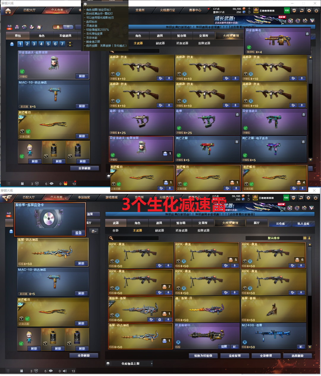装备描述:排位:可以、、、、、、、、、双清道夫-卡无限子弹、生化四防全装(可以变更背包、查看僵尸血量)无需换弹、6烈、6盘、炼狱+音效、毒蜂、清道夫-小人枪、异变清道夫、异变镇魔者、双面神、死亡之眼、MAC手枪、3把炽芒蝶刃、生化减速雷、超级对讲机、全部弹匣、、、、、、、、爆破四防:幻神(24AG皮肤)、M200-竞技荣光、98K星神、USP雷暴、COP幻灵、2个EP柯尔特荣耀、柯尔特竞技荣光、G36幻影、加利尔ACE-天袭、FAMAS G2-天戎、白虎、QBZ金色蔷薇、王者凌虎、、、裁决音效、星神音效、雷神音效、毁灭音效、炼狱音效、、、2套雷霆、5套幻灵、1套竞技荣光、1套雷霆王者、、、爆破四防(传说星骇、妮妮、影豹、研、玄豹)爆破四防(隼)