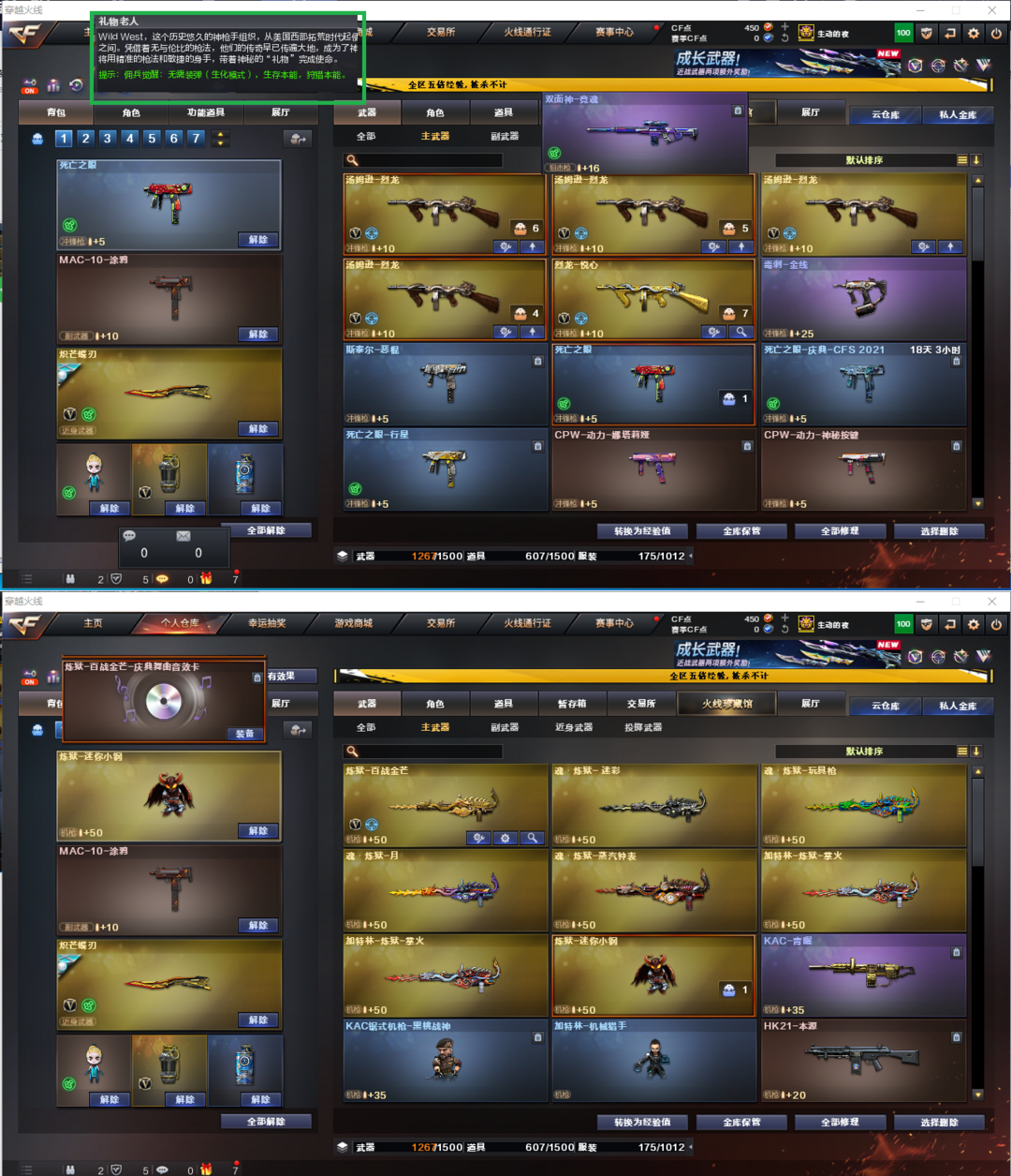 装备描述:排位:可以------------生化全装(、查看生化僵尸血量):无需换弹、5烈、炼狱、炼狱-小钢、双面神、死亡之眼、炽芒蝶刃、个生化减速雷、、、、、、、、、、、爆破四防:幻神4皮(KZ、权、EP、AG皮肤)、王者幻神、王者星神、2个USP神工天巧、COP幻灵、USP冥王、23白鲨柯尔特、玄豹左轮、2个冠军之特、USP雷暴王者、EP荣耀柯尔特、COP极地霜雄、传说圣谕、FAMAS G2-天戎、白虎、王者凌虎、QBZ金色蔷薇、、、裁决音效、白虎音效、毁灭音效、雷神音效、炼狱音效、、、4套幻灵、1套竞技荣光、4套神工天巧、3套云龙、1套玄豹、1套雷霆王者、2套雷暴王者、、、生化人物(礼物老人)爆破四防(传说艾莉莎、妮妮、雾萌萌、王者小乔、暗夜审判、职业经理)