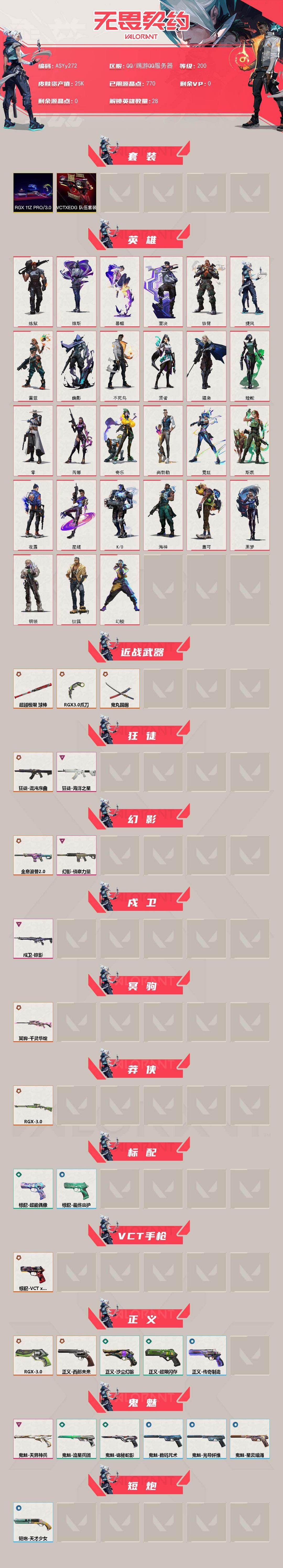 装备描述:冻结三分钟内解除,短信通知重新上即可!喜欢收藏不迷路、游戏异常进小黑屋、时间不够请提前续租或者不要开局 【套装】:RGX 11z Pro//3.0套装,VCTxEDG 队伍套装 【英雄】:幻棱,炼狱,维斯,暮蝶,钛狐,壹决,铁臂,捷风,雷兹,幽影,不死鸟,贤者,猎枭,蝰蛇,零,芮娜,奇乐,尚勃勒,霓虹,斯凯,夜露,星礈,K/O,海神,盖可,黑梦,钢锁 【近战武器】:近战武器-RGX 11z Pro//3.0 爪刀,近战武器-鬼丸国纲,近战武器-超越极限 球棒 【狂徒】:狂徒-混沌序曲,狂徒-海洋之星 【幻影】:幻影-全息波普//2.0,幻影-侦察力量 【戍卫】:戍卫-掠影 【冥驹】:冥驹-千灵华绽 【莽侠】:莽侠-RGX 11z Pro//3.0 【标配】:标配-超能偶像,标配-最终庇护 【VCT手枪】:标配-VCT x EDG 【正义】:正义-RGX 11z Pro//3.0,正义-西部未来,正义-超限闪存,正义-沙尘幻旅,正义-传奇制造 【鬼魅】:鬼魅-天界神兵,鬼魅-流星兵团,鬼魅-诡秘蛇影,鬼魅-光导纤维,鬼魅-数码咒术,鬼魅-星云暗涌 【短炮】:短炮-天才少女 【卡面】:《