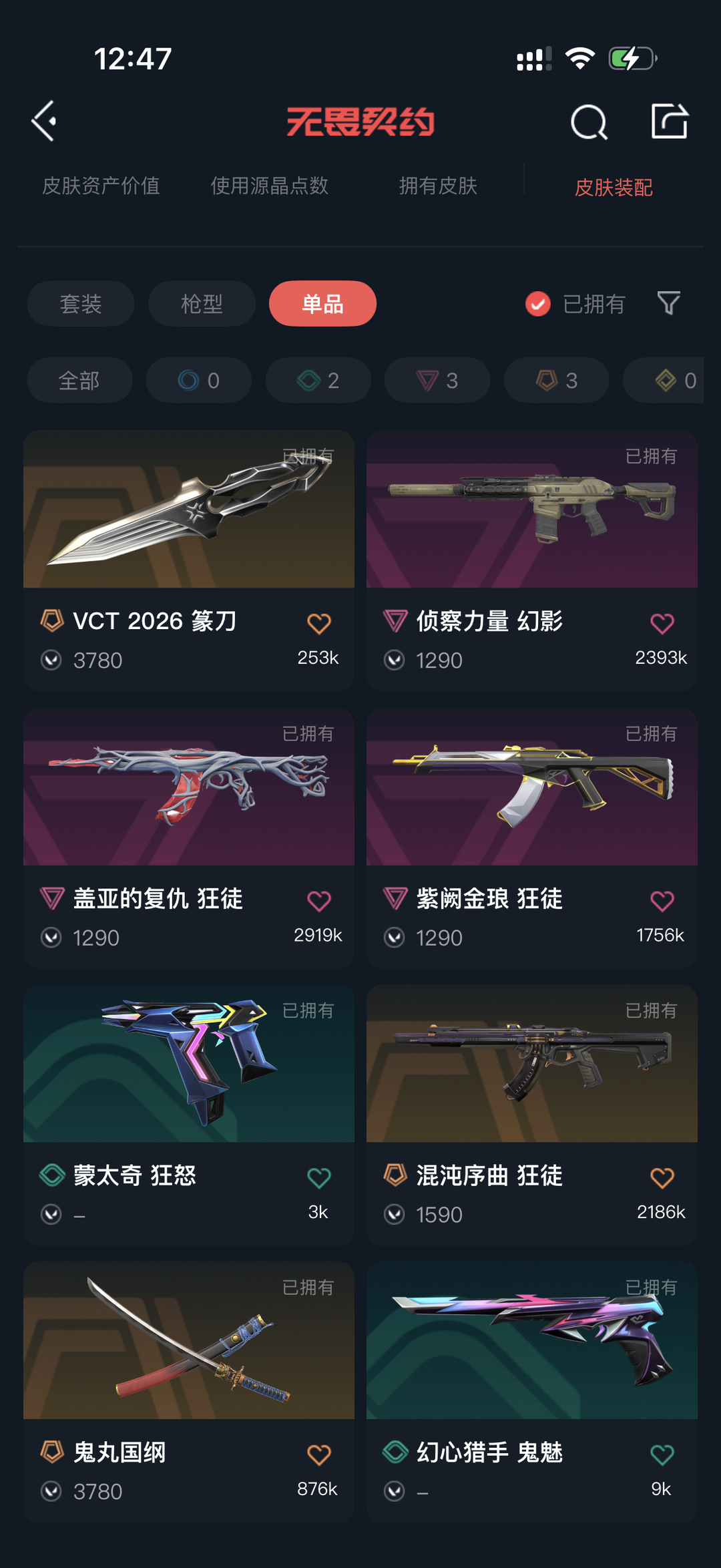 可排位⭐VCT2026篆刀⭐鬼丸国纲太刀⭐混沌序曲狂徒⭐盖亚的复仇狂徒⭐紫阙金琅狂徒⭐侦查力量幻影⭐