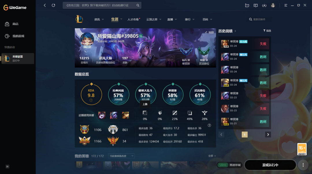 限制: 撤单率<50%才可租用此帐号英雄: 172