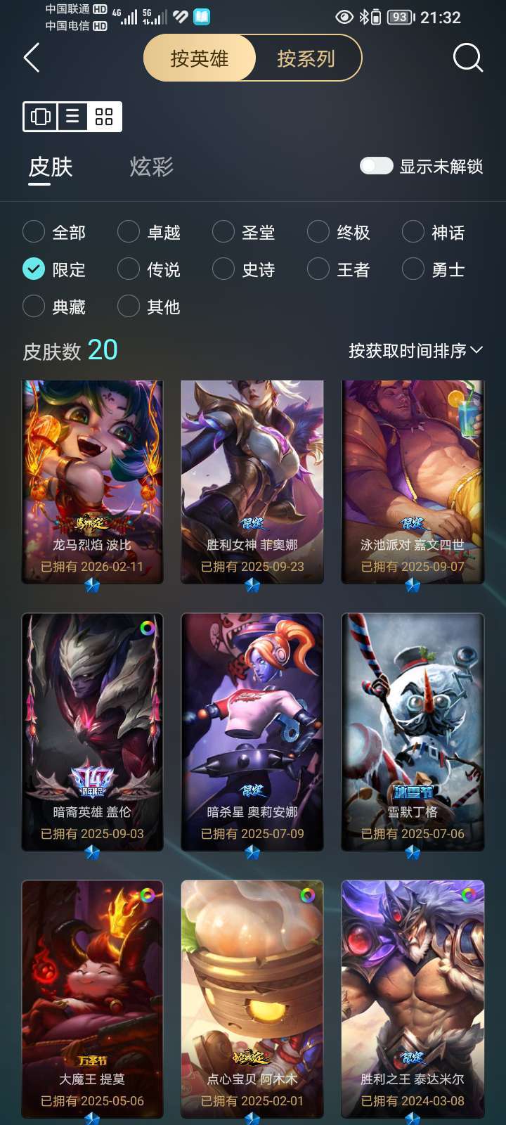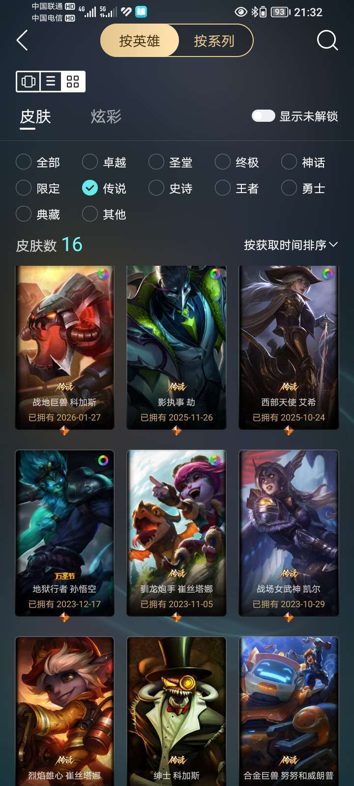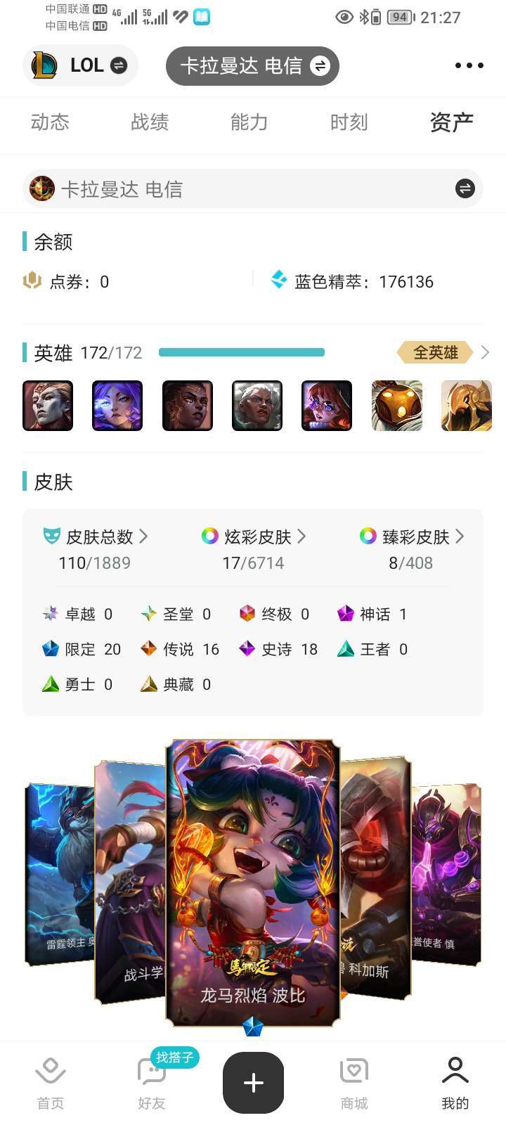 联盟二区,可打排位,所有模式可玩,总皮肤110,神话1,限定20,传说16,史诗18个