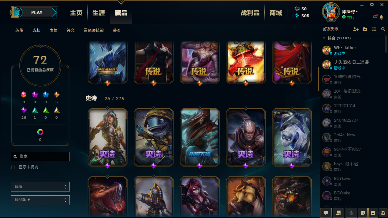 装备描述:105英雄 72皮肤 9限定 龙年琴女