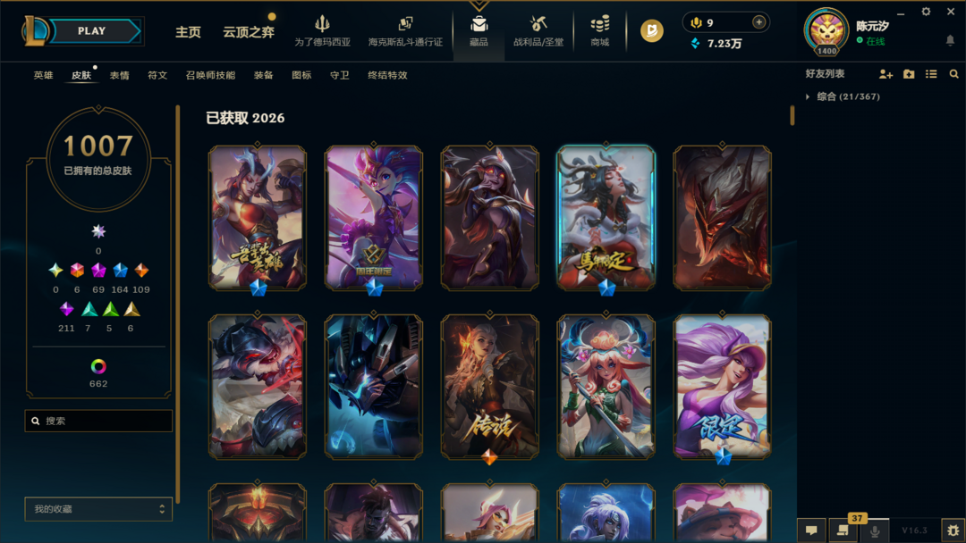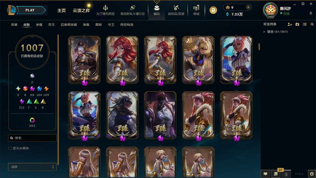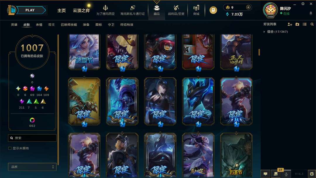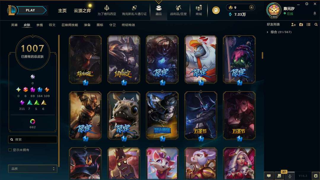 海克斯乱斗通行证冲级 原皮1007 炫彩662 妹子号 全英雄 可排位