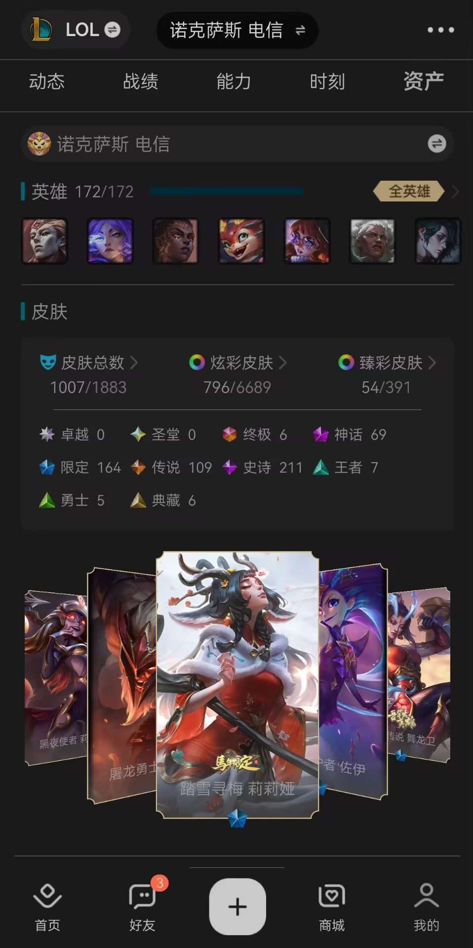 装备描述:海克斯乱斗通行证冲级中,特惠租。最新入号皮肤踏雪寻梅莉莉娅。号上1007皮肤,662炫彩,52臻彩。在特权网吧能用的炫彩能到800。联盟二区诺克萨斯。云顶白银,乱斗隐藏分1300。 6终极,69神话,164限定,109传说,211史诗等上千皮肤。 777个头像,240个表情,42个10级英雄成就,24个9级成就,共140个5级以上可亮熟练度的英雄。62个不同的眼皮肤,顶级游戏开黑牌面体验。 逃跑的拉黑处理。骂人的被我发现的话也会被拉黑昂! 已封20人。 (如刚租号后…登入游戏显示重新连接,情况为上一位租客还没打完。。。需等待上位租客打完此局后,才能登进!有概率你会直接进入对局,那就加油啦) 在固定的超凡特权网咖玩的可以经常来租,我会及时帮你们领取胜场奖励中的网费券哒 关联北极星神梅尔冬季仙境泽丽炫金赵云银白审判天使等等