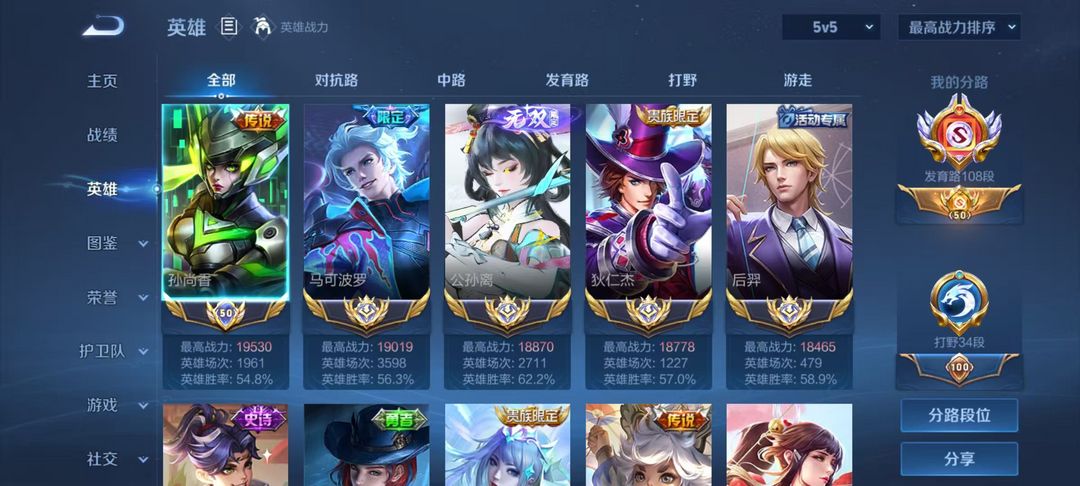 108段发育路⭐2w分五国服公孙离马克狄仁杰后羿⭐超多省级限定皮肤⭐可排位