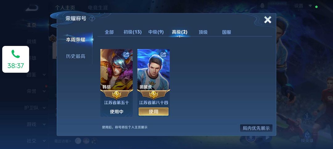 本周在榜省标韩信裴擒虎⭐历史国服裴擒虎国服元流之子⭐小国服李白后羿赵云⭐极品带妹帅号