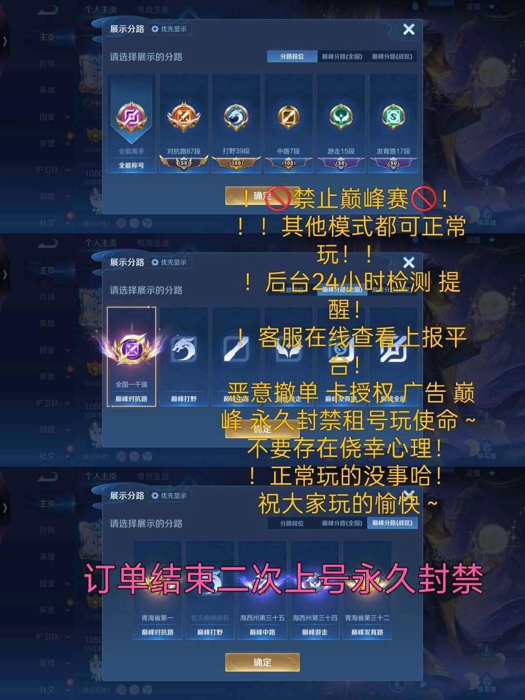 限制: 租号20次及以上 | 撤单率<30%才可租用此帐号装备描述:本周截图⭐下单前请老板们考虑好再下单⭐【租错号了】【不想玩了】等等恶意撤单脚本自动永久拉黑平台记录⭐ 禁止巅峰赛● ★开挂美化包等违规第三方软件导致封号将会平台申诉封其租号玩账号并追究其法律责任★恶意撤秒改密码顶号拉黑并申诉追回租金喜欢此账号租号玩平台直接租赁即可●以下违规情况扣除保证金①该账号禁止改名 ②违规导致扣信誉积分③非法发言导致账号禁言④聊天记录出现诈骗记录⑤禁止巅峰赛打巅峰拉黑 租号玩管礼员将24小时通过后台监控! 各位老板下单前请考虑清楚,恶意投诉租错的全部脚本自动永久拉黑 各位老板下单前请考虑清楚,恶意投诉租错的全部脚本自动永久拉黑 各位老板下单前请考虑清楚,恶意投诉租错的全部脚本自动永久拉黑 那种不想玩了或者是租错号了的都会永久拉黑,下单前请看清也考虑清楚再下单 那种不想玩了或者是租错号了的都会永久拉黑,下单前请看清也考虑清楚再下单 那种不想玩了或者是租错号了的都会永久拉黑,下单前请看清也考虑清楚再下单 恶意投诉撤单的都会永久拉黑,文明租号,下单还请注意,恶意投诉的直接拉黑 文明租号,正常上号后撤单的脚本自动永久拉黑 游戏上去后撤单的直接永久拉黑 上了号恶意撤单的全部