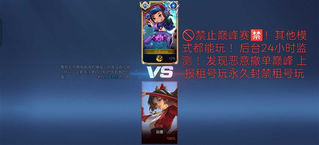 限制: 租号2次及以上 | 撤单率<65%才可租用此帐号装备描述:恶意挂机撤单永久拉黑平台记录 禁止巅峰赛● ★开挂美化包等违规第三方软件导致封号将会平台申诉封其租号玩账号并追究其法律责任 ★恶意撤秒改密码顶号拉黑并申诉追回租金 喜欢此账号租号玩平台直接租赁即可 ●以下违规情况扣除保证金①该账号禁止改名 ②违规导致扣信誉积分③非法发言导致账号禁言④聊天记录出现诈骗记录⑤禁止巅峰赛 打巅峰拉黑 租号玩管理员将24小时通过后台监控!