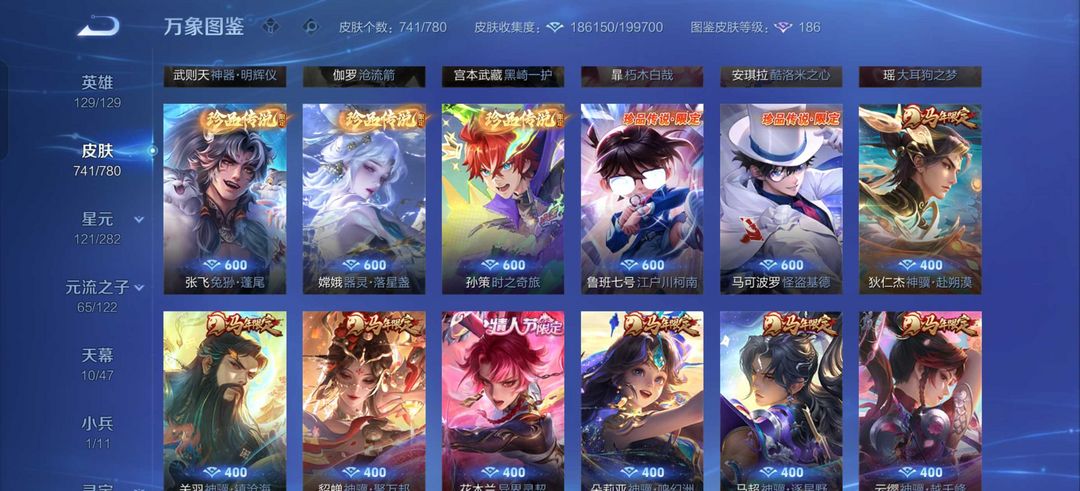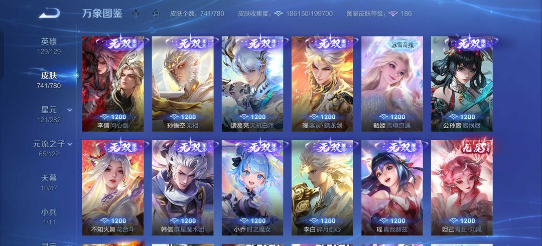 李信猴哥无双新年限全套闪光卡片/全无双全珍品伽罗/总有741皮!西施小国荣耀17皮
