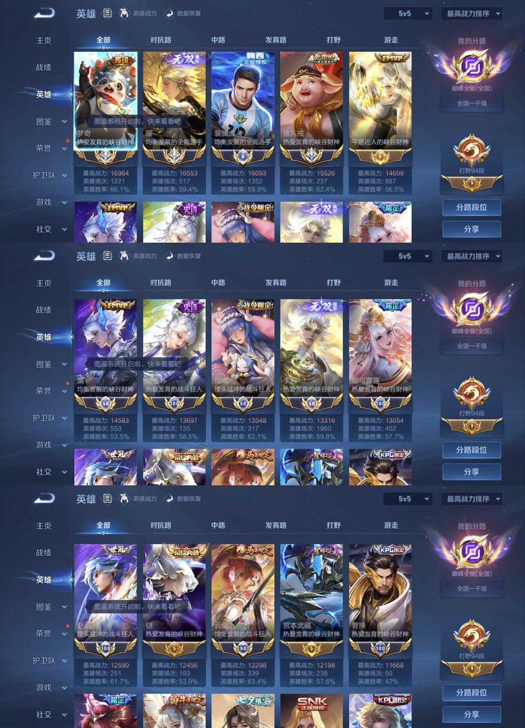 V10巅峰打野94段魔方亮♏巅峰全能全国1千强♏梅西马年限定♏1.6万66胜率大国服梦奇曜老虎李白镜