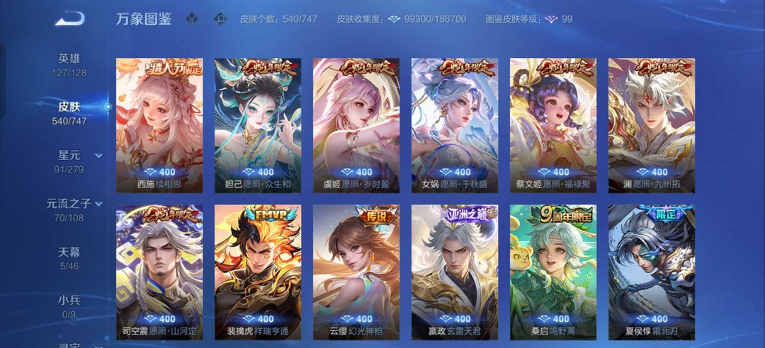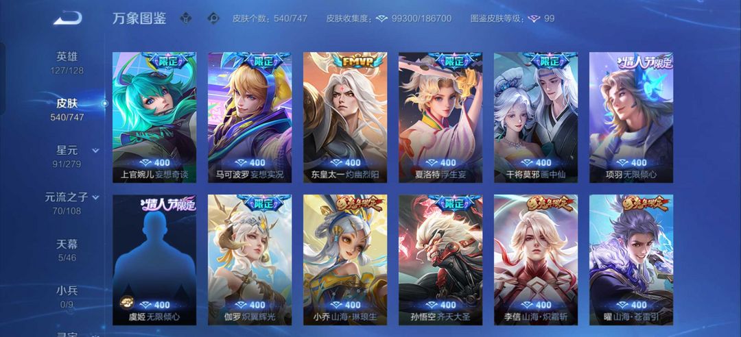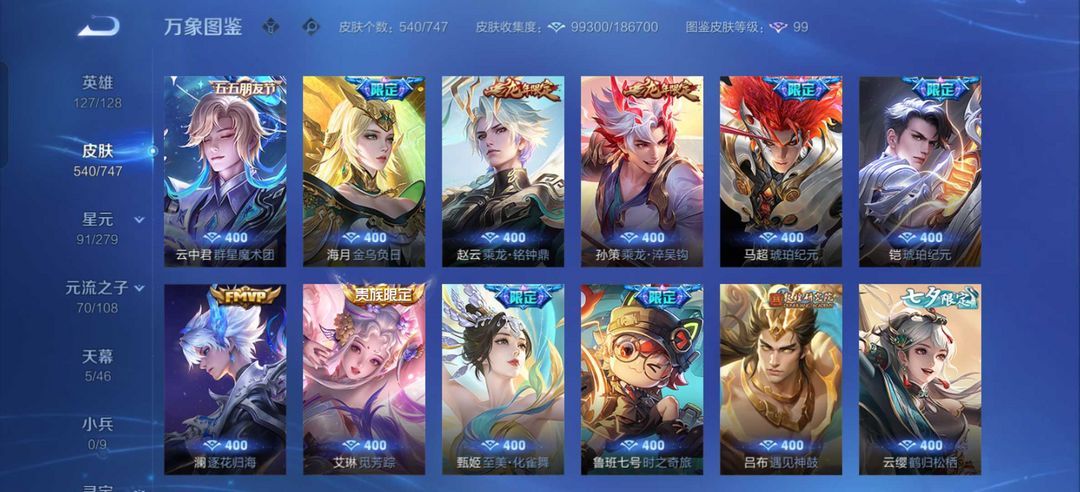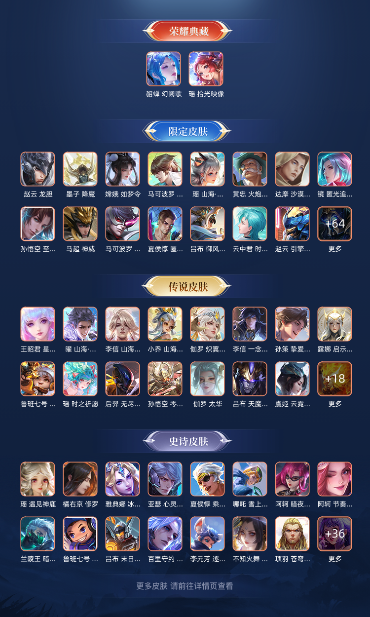 装备描述:540皮肤❤️貂蝉慕夏❤️6珍品传说皮❤️大耳狗库洛米❤️怪盗基德❤️72传说皮❤️满蛇年限定❤️云诺千山