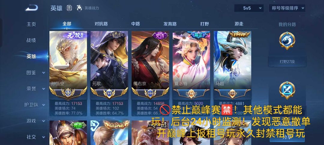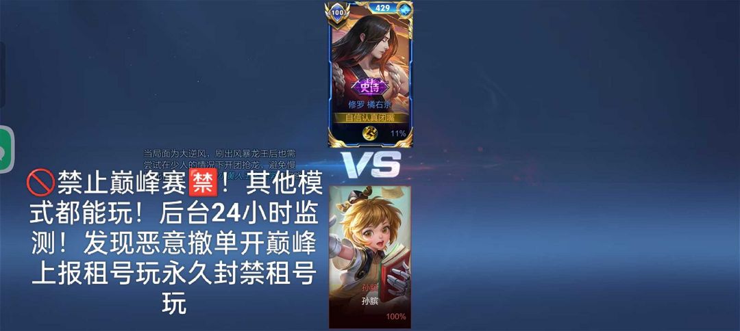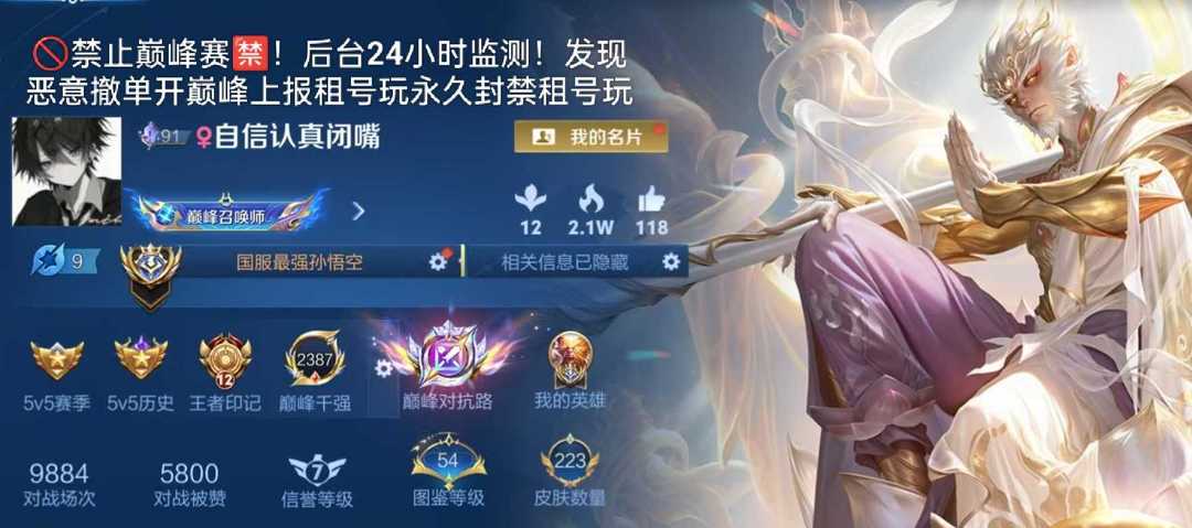 限制: 租号3次及以上 |装备描述:所以号都是一号一密码 可排位禁止巅峰赛 否则拉黑!