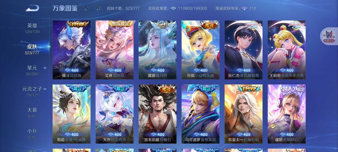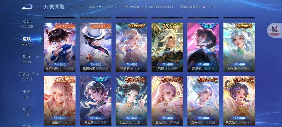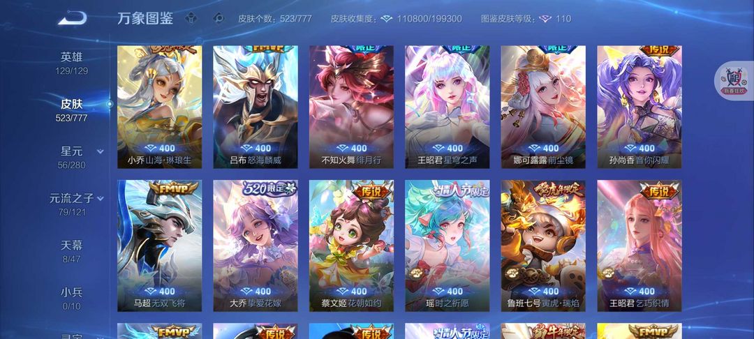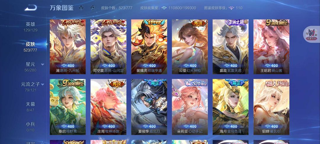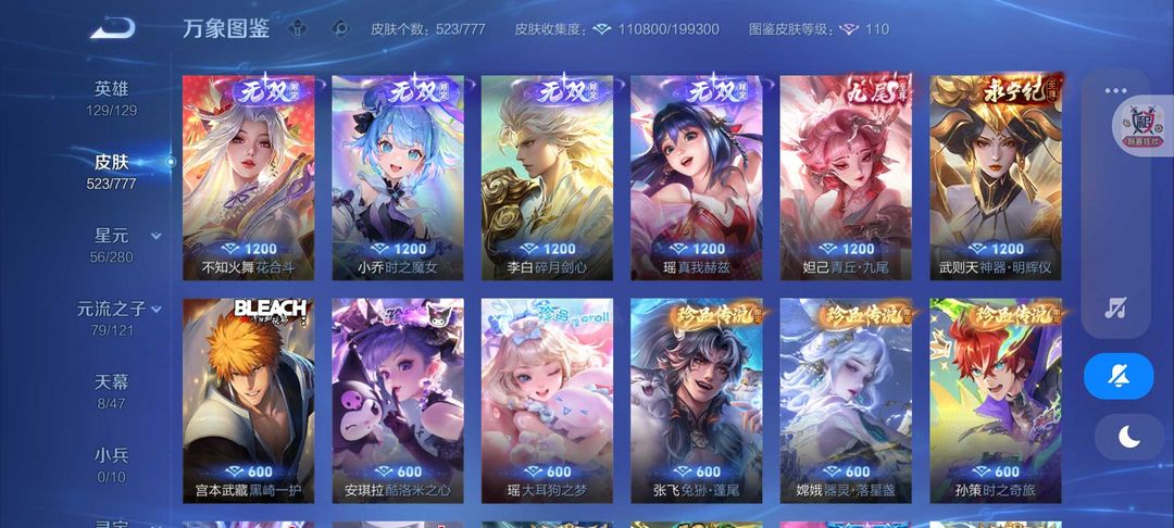 无双V10号❤523皮肤女号❤游走44段8天幕貂蝉慕夏❤7典藏11无双❤8珍品无相神罪离烟恨花合斗死