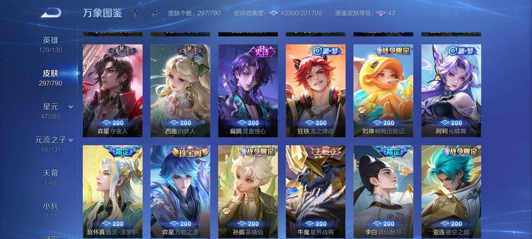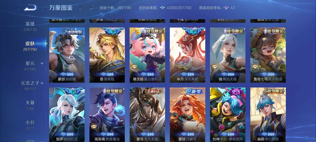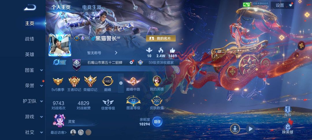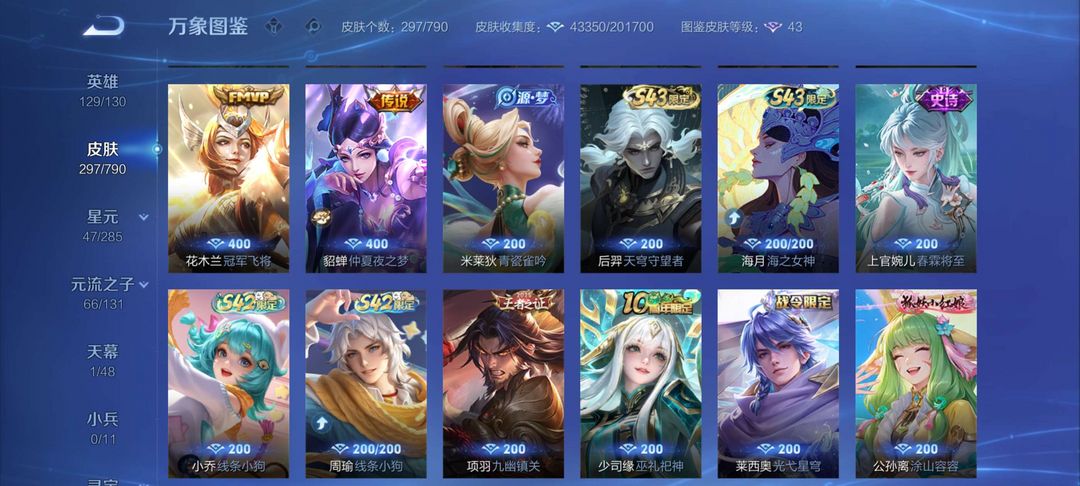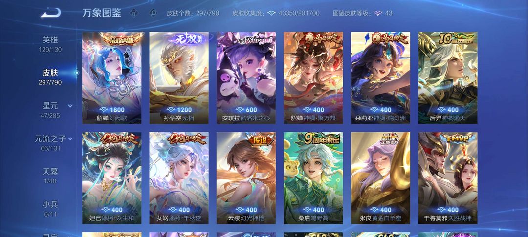 装备描述:貂蝉幻阙歌典藏+多套年限美皮,297款皮肤挑到手软!不管是古风限定还是可爱联动,甜酷风全都有,主页自带貂蝉的氛围感,每局换个皮肤都不重样,玩着就是享受!请游戏局内保持文明,防止禁言影响他人游戏,祝您玩得愉快!