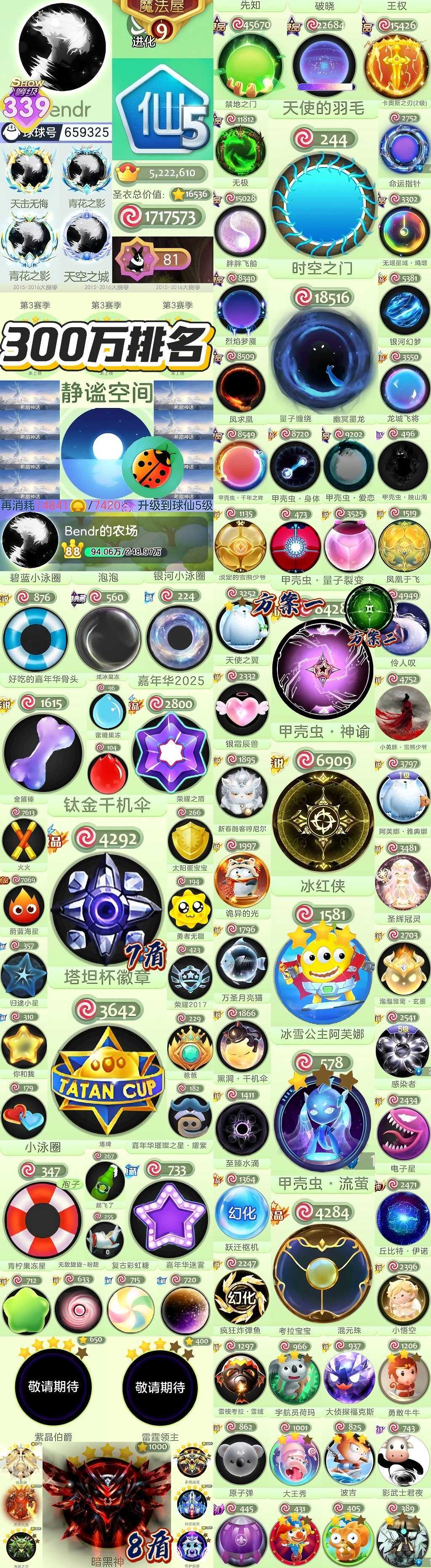 装备描述: 塔坦杯 甲壳虫第3赛季 钛金伞 泳圈 满级冰红茶 天使羽毛 王权 魔镜什么补墙 准时空 爱恋甲壳虫 1200m vp百万吞噬