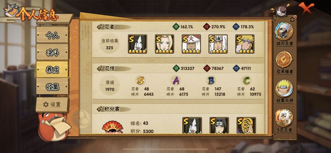 装备描述:熊猫,万蛇,蛞愈 满级霸体,忍法帖忍者较多,48S 66A忍,五影会谈斑已招募,收藏不迷路 喜欢本账号请点 ☆收藏☆ 方便下次租用,谢谢光临惠顾!