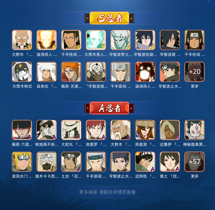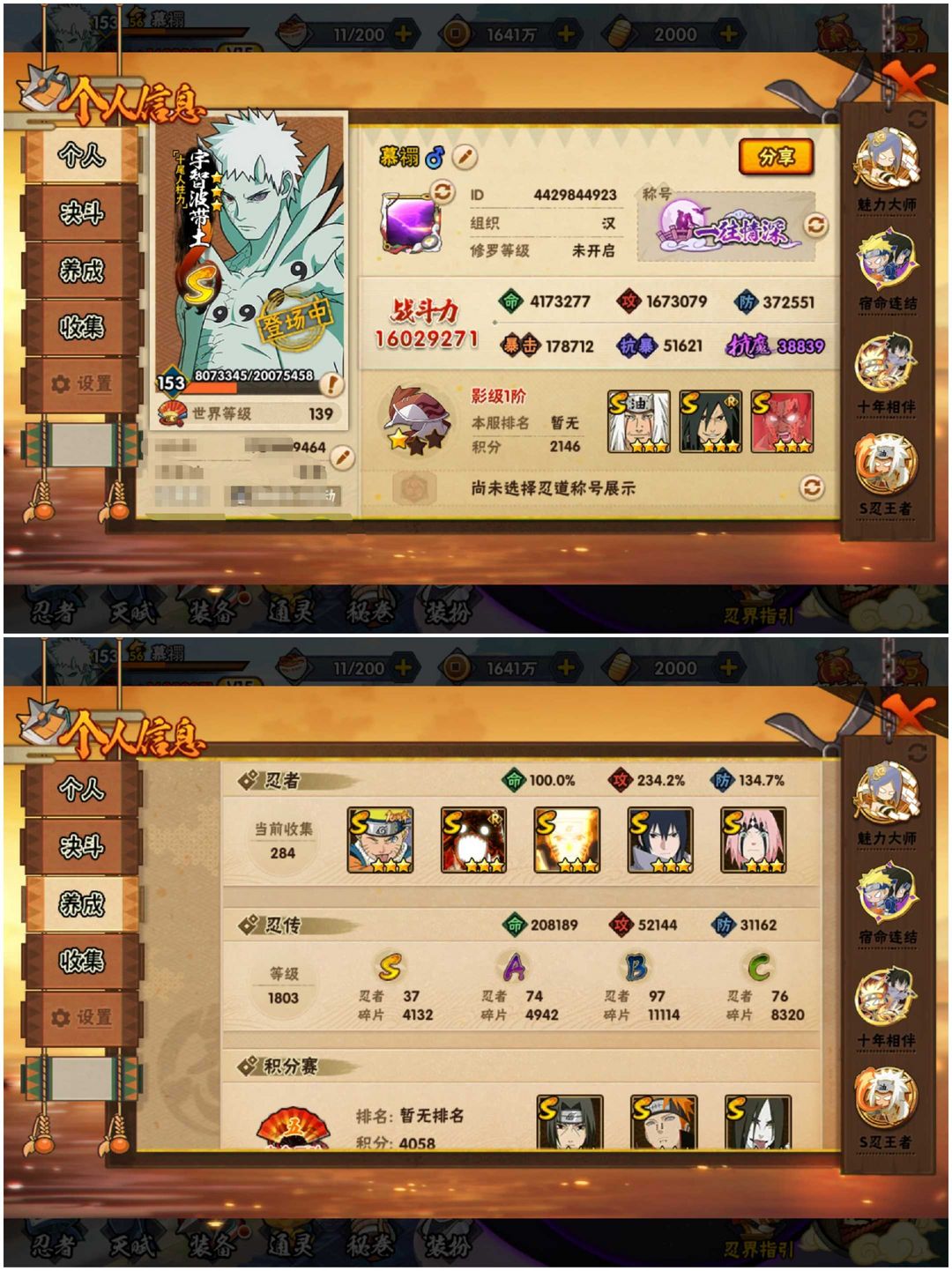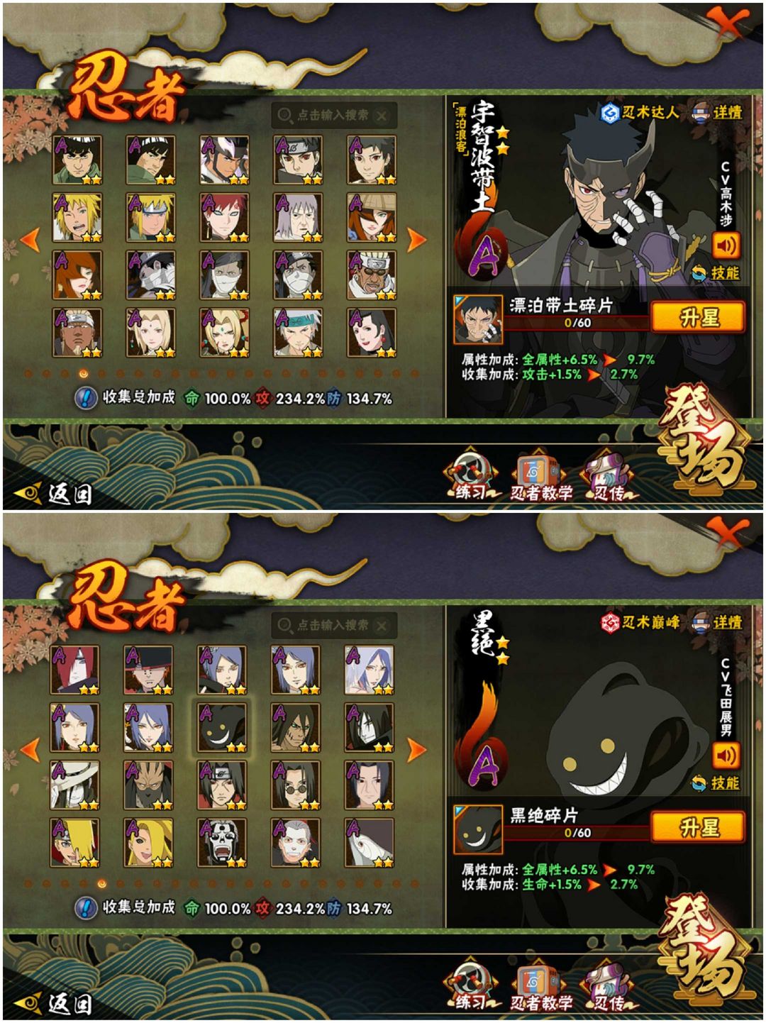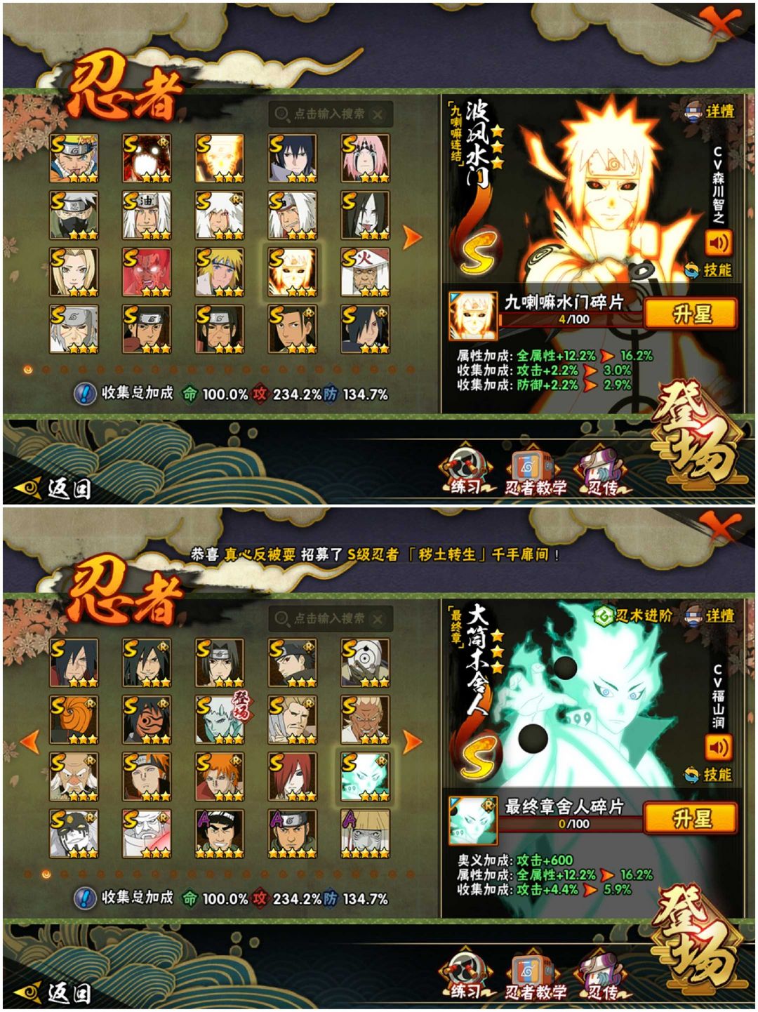 限制: 撤单率<40%才可租用此帐号装备描述:S忍者:【大野木 「忍界大战」,漩涡鸣人 「九喇嘛连结」,千手柱间 「木叶创立」,大筒木舍人 「最终章」,宇智波带土 「十尾人柱力」,宇智波佐助 「永恒万花筒」,宇智波斑 「木叶创立」,千手柱间 「秽土转生」,大筒木桃式,自来也 「舞之豪杰」,佩恩·天道 「超」,“宇智波斑” 「白面具」,千手扉间 「秽土转生」,漩涡鸣人 「暴怒·第六尾」,宇智波止水 「须佐能乎」,艾 「忍界大战」,自来也 「传说中的三忍」,漩涡鸣人·宇智波佐助,波风水门,大蛇丸,纲手,鬼灯幻月 「二代目水影」,佩恩 「天道」,千手柱间,宇智波鼬 「须佐能乎」,猿飞日斩,长门 「秽土转生」,自来也,神秘面具男 「红夜之刃」,宇智波斑 「秽土转生·解」,春野樱 「忍界大战」,宇智波斑 「神驹佑将」,大筒木金式,波风水门 「九喇嘛连结」,旗木卡卡西 「须佐能乎」,迈特凯 「死门」】 A忍者:【佩恩·六道 「漂泊浪客」,桃地再不斩 「秽土转生」,大蛇丸 「新春限定」,我爱罗 「新春限定」大野木 「侠隐江湖」,照美冥 「侠隐江湖」,达鲁伊 「五代目雷影」,神秘面具男 「忍者之路」,波风水门 「青年」,旗木卡卡西 「元气夏日」