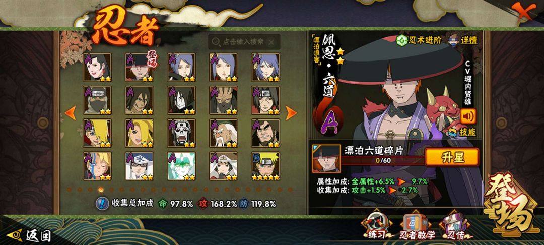 装备描述:神驹斑 新春小南 漂泊佩恩 创立柱间 红叶带土 大筒木舍人 机械鸣人 神农 大筒木桃矢 再不斩 巳月 近期忍法帖