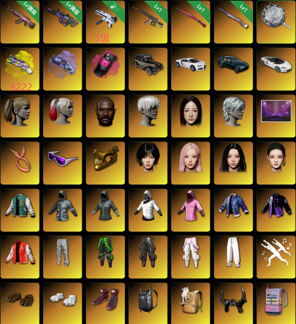 二级190211满女团大厅布加迪✨⑩级火麒麟⑩级霓虹AUG✨⑩mp5彩烟✨黑鬼小丑女尼尔