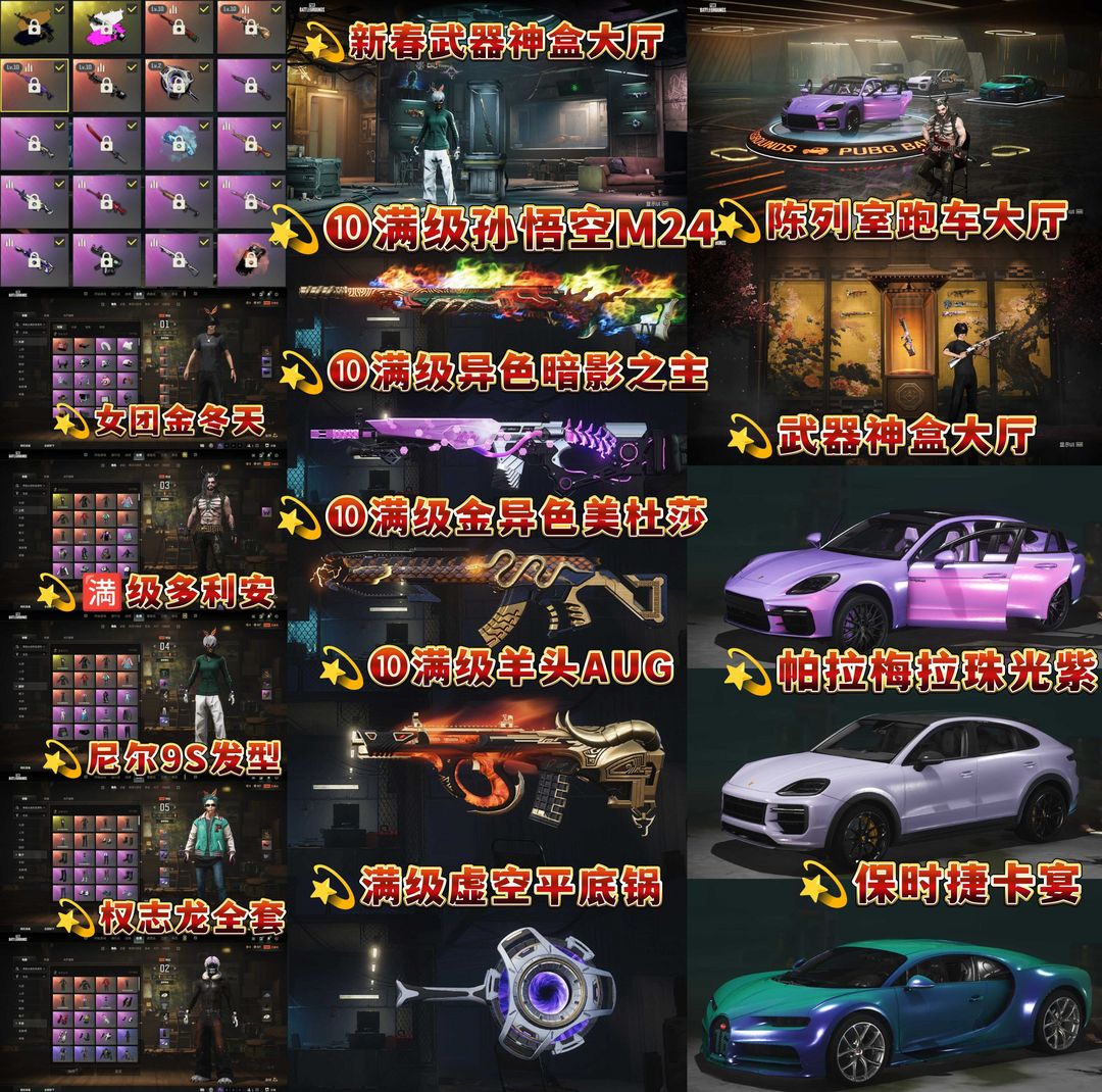 保时捷帕拉梅拉布加迪❿满级异色暗影之主MK❿满级孙悟空❿满级金异色美杜莎❿满级牛头AUG满级多利安