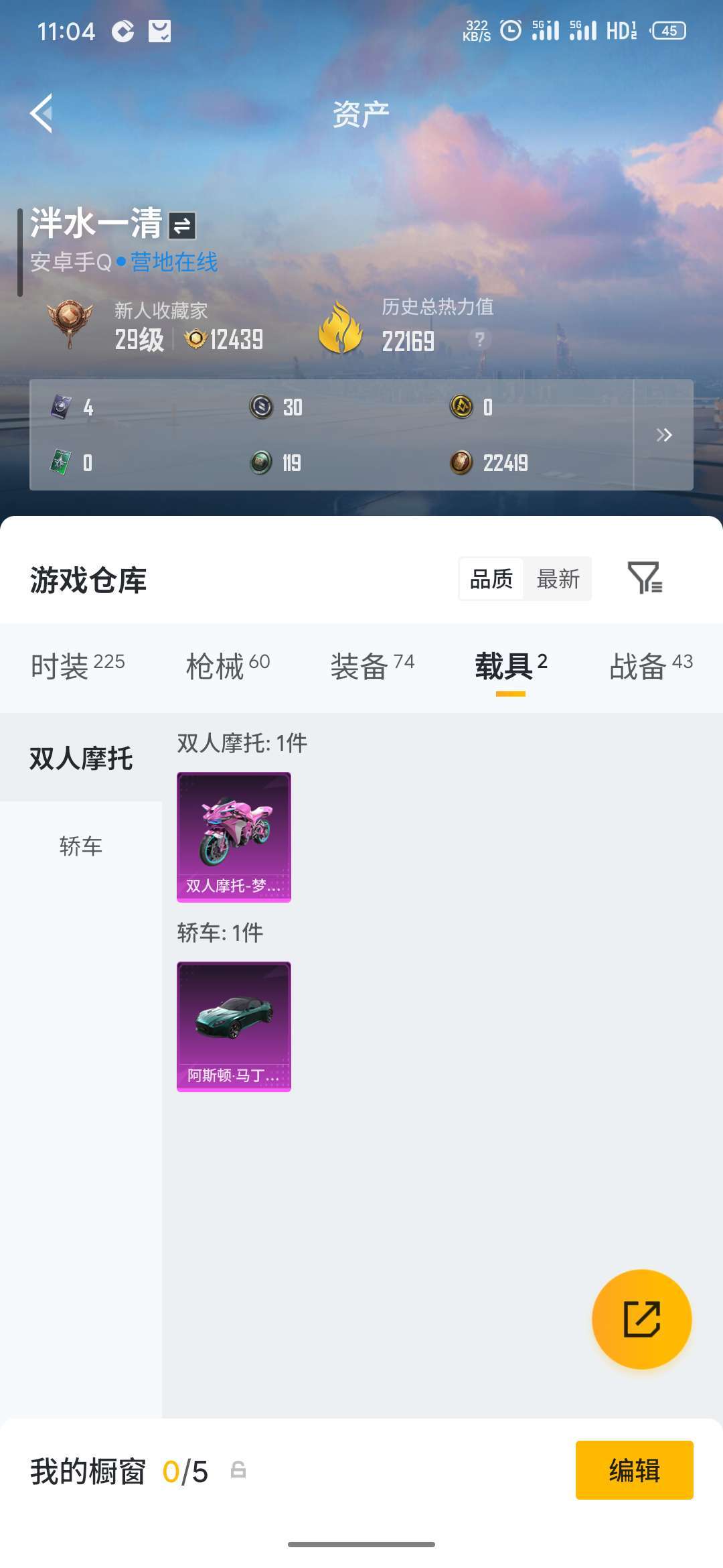 装备描述:两载具阿斯顿马丁,火箭少女摩托,黄金段位,带人好用