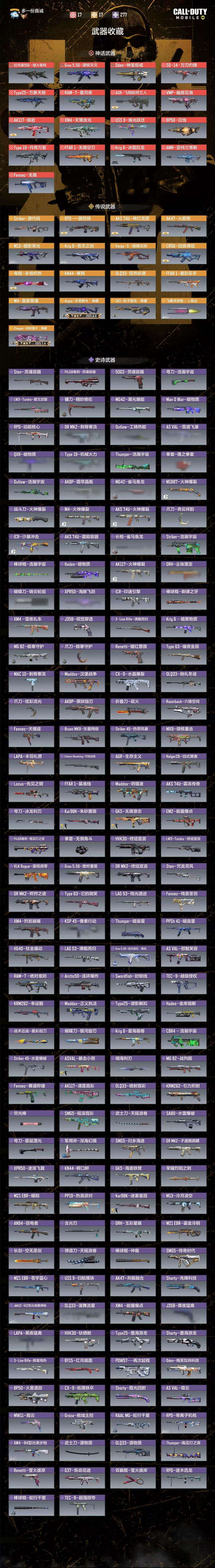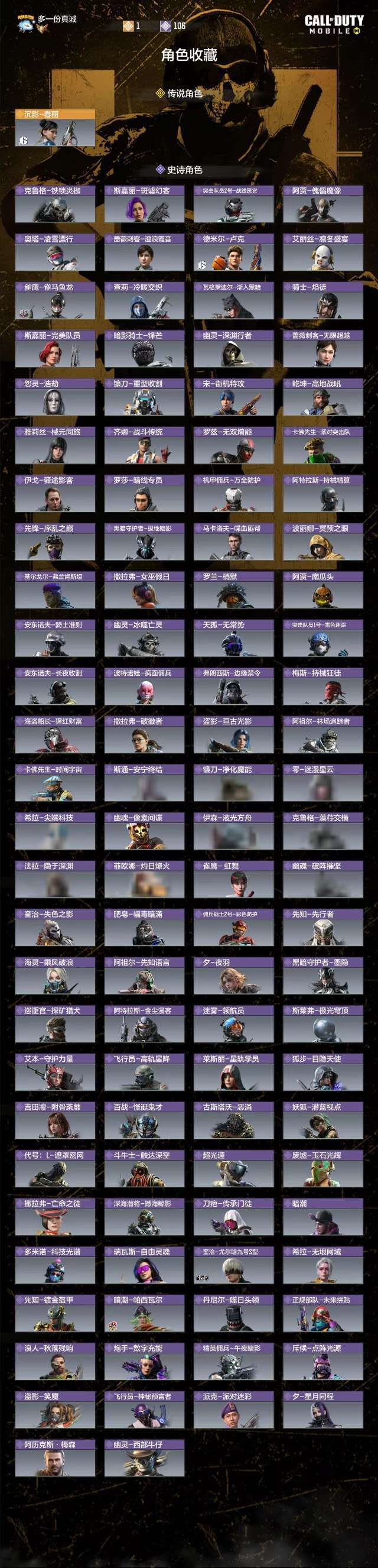 15把神话3把满级神圣惩戒和源核天灾燧火雷鸣17把传说角色106个紫角色三把典藏一个传说角色春丽