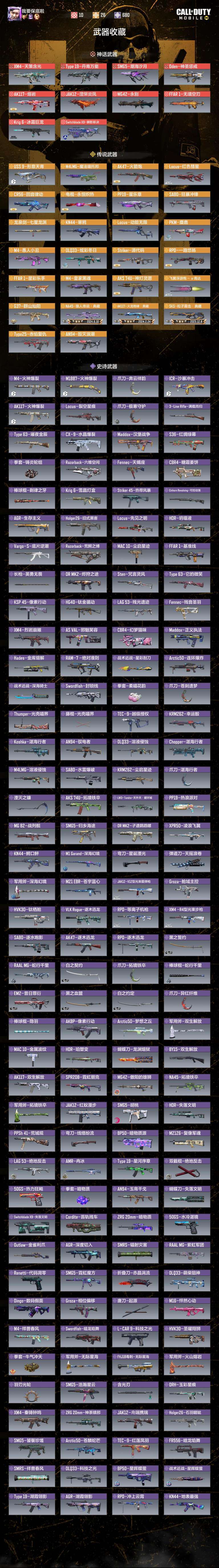 装备描述:- 神话武器:11把(XM4-天策含光、Type19-丹青万壑、SMG5-潮海汐月、Oden-神圣惩戒、AK117-熔岩、JAK12-涅槃炎凤、MG42-永别、FFAR1-无境空刃、Krig6-冰霜巨龙、Switchblade X9-瞬影斩决等) - 传说武器:24把(USS9-形意天青、M4LMG-魔法磁托邦、AK47-火箭炮、Locus-红色彗星、CR56-回音律动、电棍-永恒炽热、PP19-星乐章、SA80-狂暴冲锋、龙泉剑-七星龙渊、KN44-寒鸦、Locus-动能无限、PKM-麋鹿、M4-愚人小丑、DLQ33-炫彩冬日、Striker-源代码、RPD-一路悠扬、FFAR1-星彩乐手、M4-皇家黑魂、AKS74U-神灯灵愿、飞翼浮游炮-v高达、G37-群山灿阳、NA45-狼人传说·典藏、AK117-火龙咆哮·典藏、SKS-粒子震击·典藏、Type25-赤焰复仇、AN94-毁灭浪潮) - 史诗武器:数量极多,覆盖全品类枪械与近战武器,还有多款联动皮肤(如高达、胡桃等)